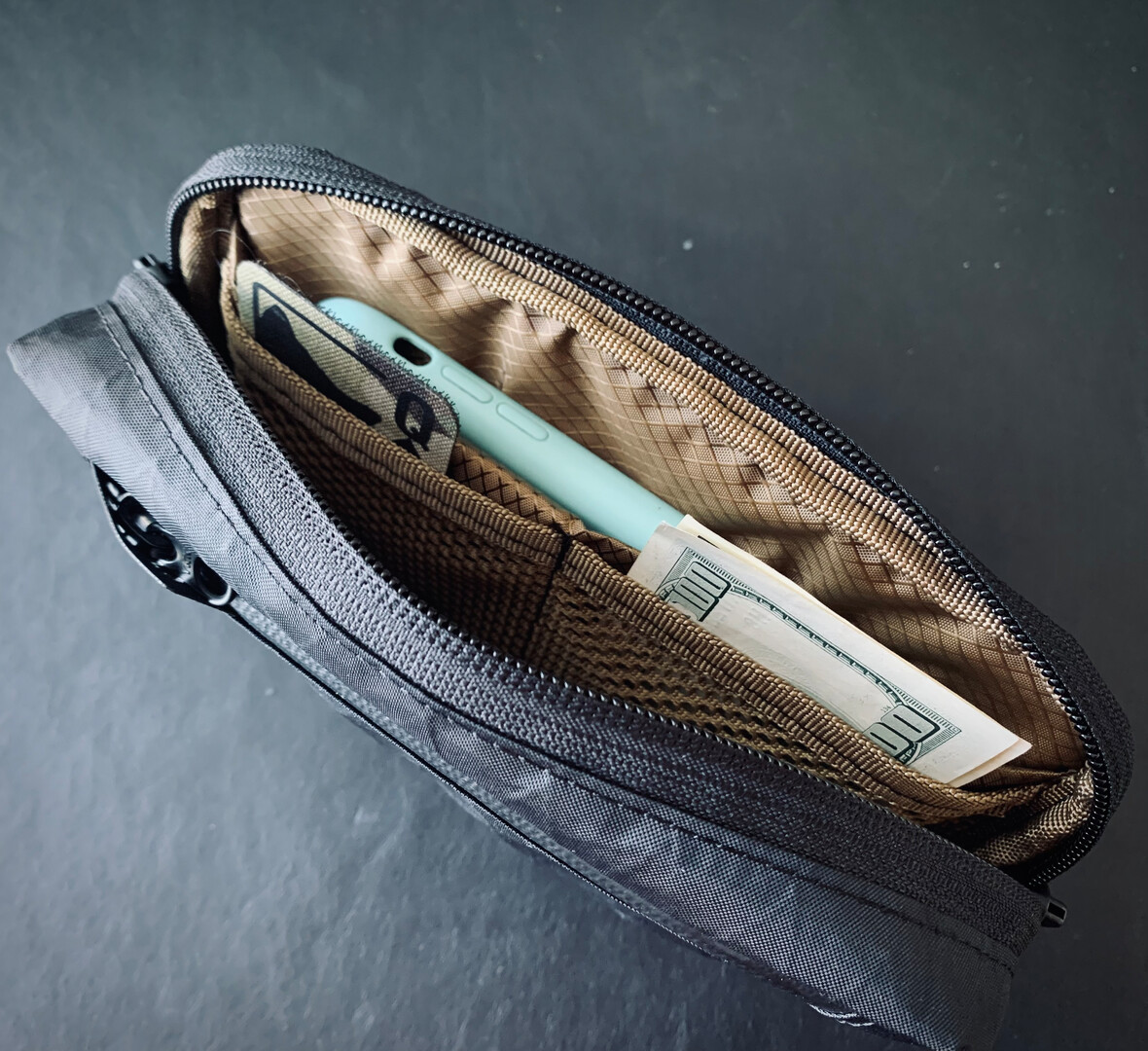 There is also a compartment for EDC items. Front flat zip pocket for small items and back flat open pocket for cash, documents or other flat items