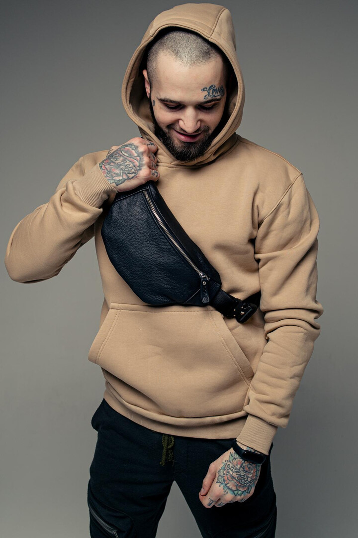 This men’s waist bag, made of genuine grained leather, impresses with its original design and practicality.