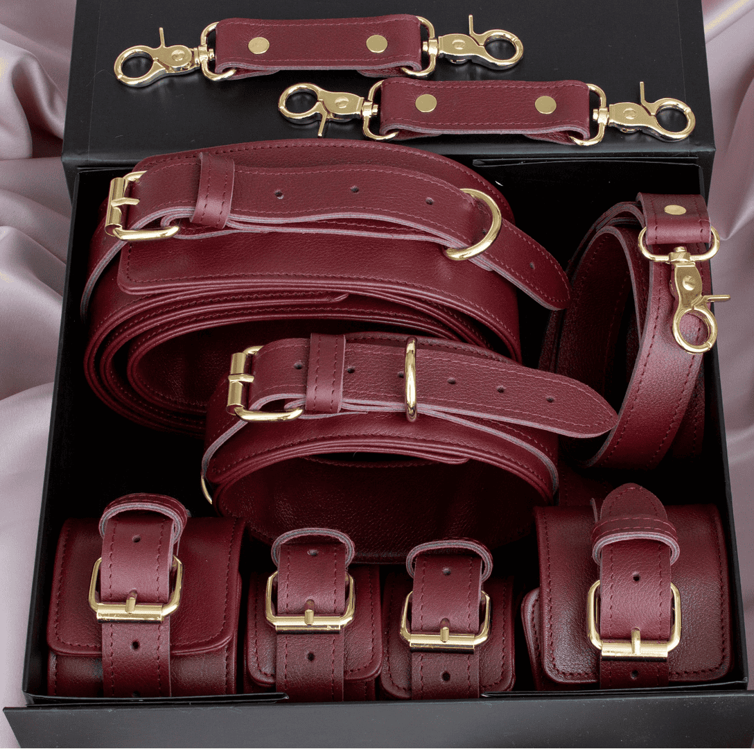 Set [5in1]: handcuffs, ankle ,thigh cuffs, collar with leash, waist Belt, 3 short hogties, 4-way connector