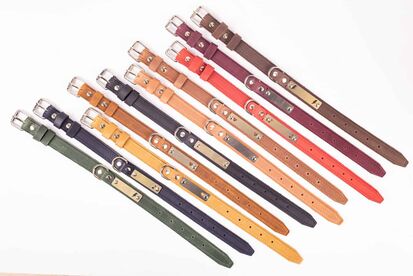 For fire-branding I use Arial font with all capital letters and the height of the letters is 1/3" Can be made in silver/gold/rose gold/blue/red/peony up to 10 symbols. Etched metal letters on the stamps are heated up and branded deep into the leather with up to 3000 pounds force. The sample in photo #10