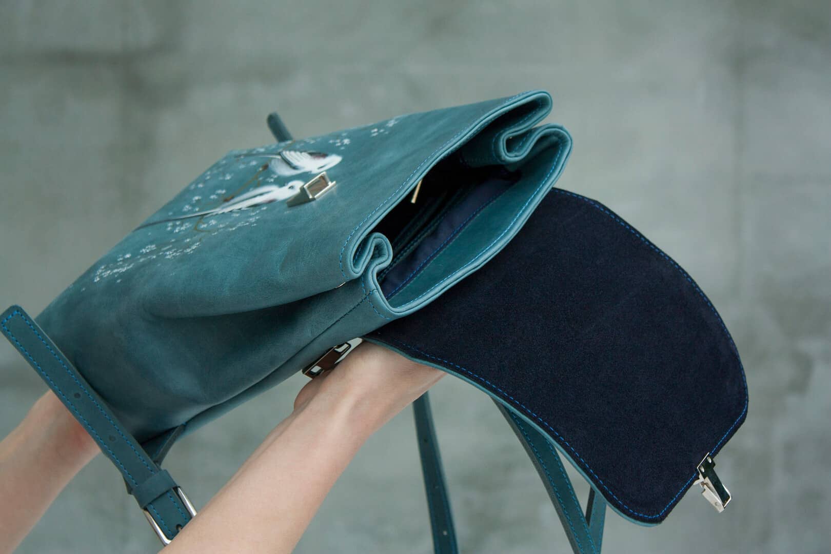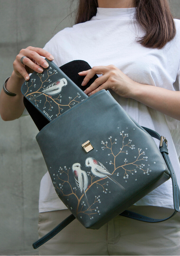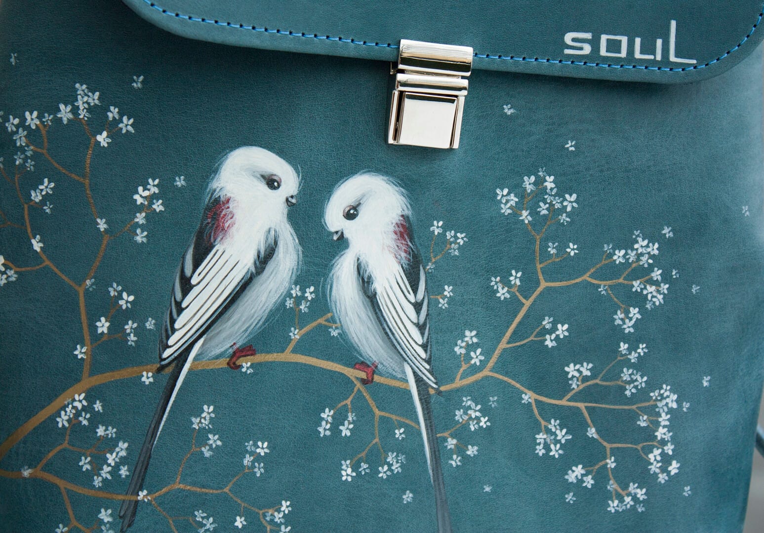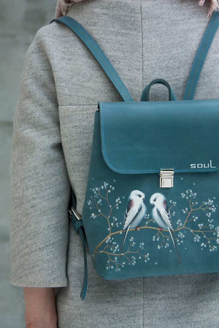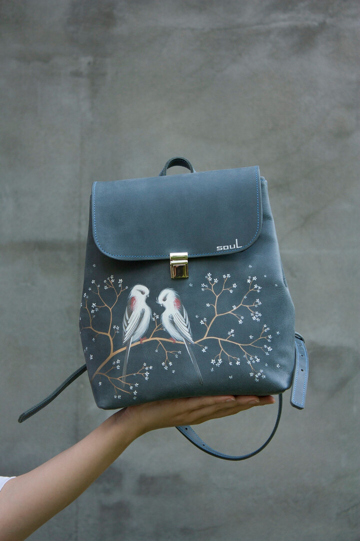 Women leather backpack with white birds long-tailed tit / Blue vintage leather backpack