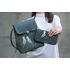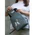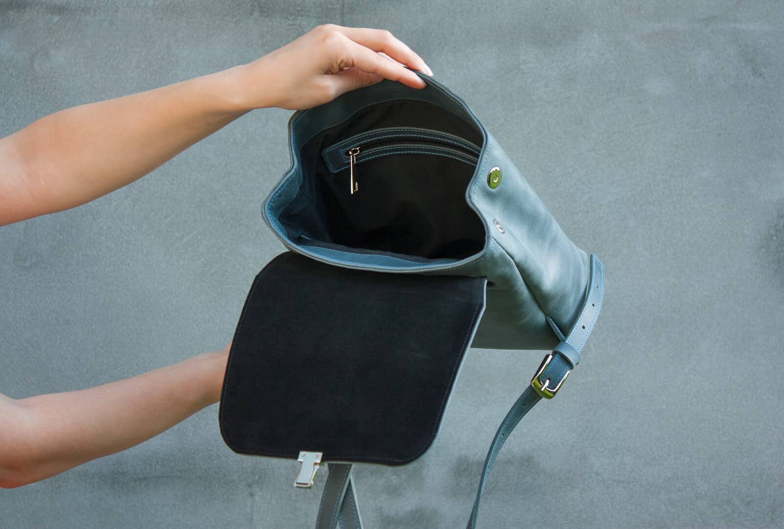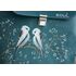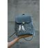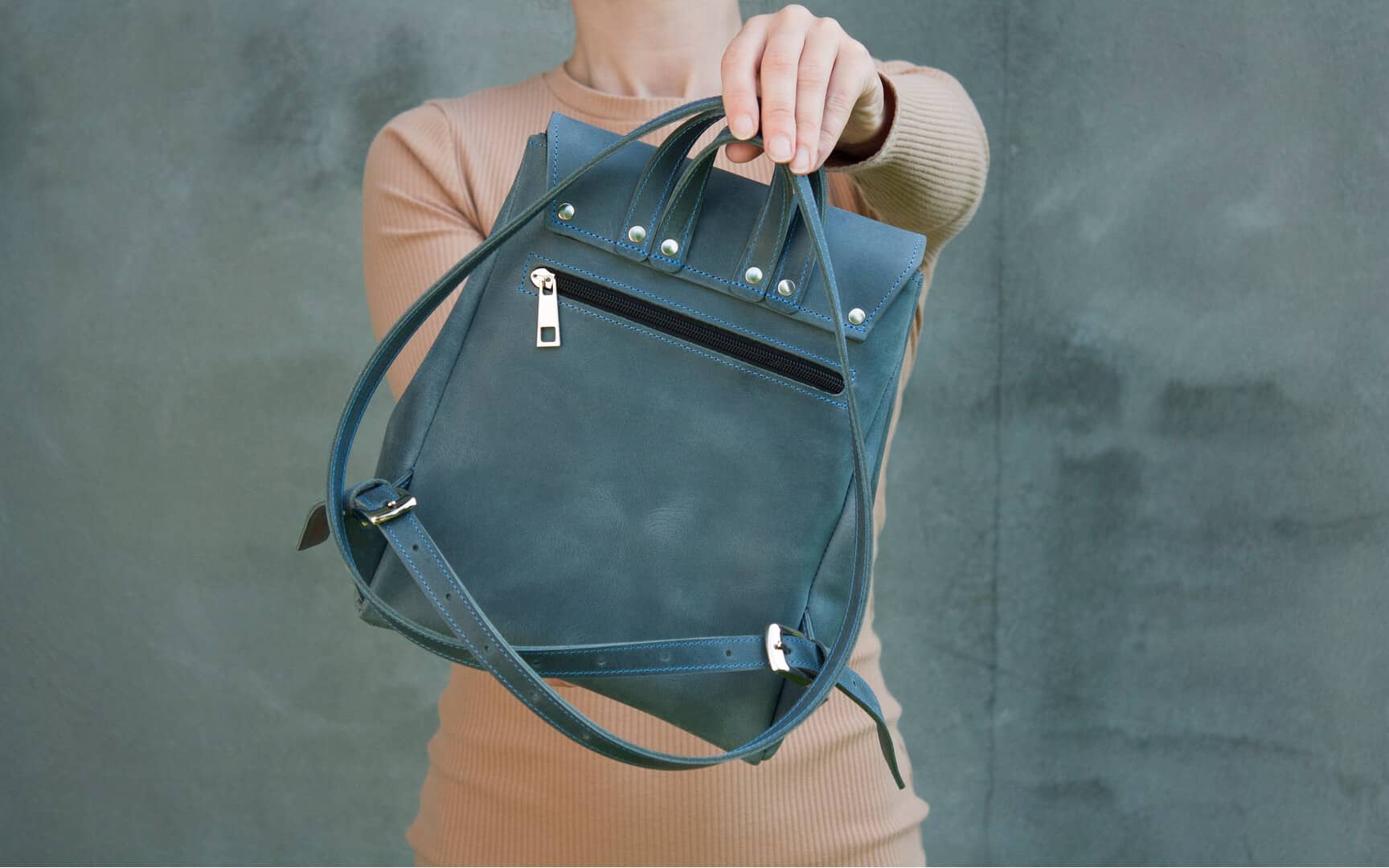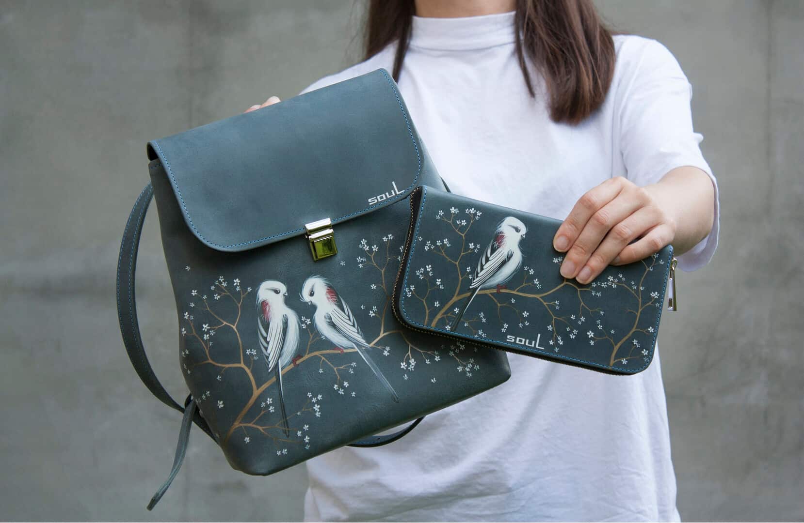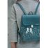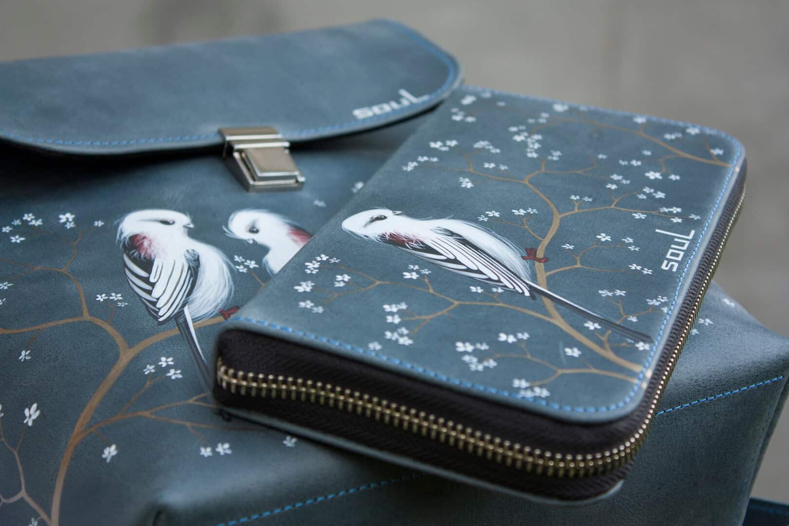 Women leather backpack with white birds long-tailed tit / Blue vintage leather backpack
