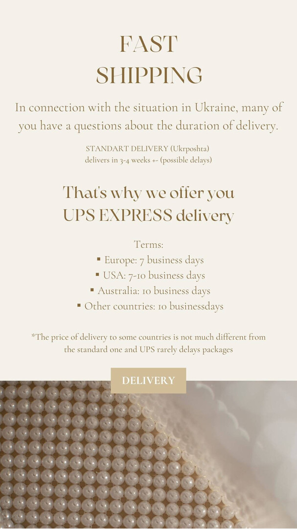 We ship all the parcels from Ukraine (from our logistics centers in Kyiv and Chernivtsi) via international services (FedEx, UPS) in two stages.