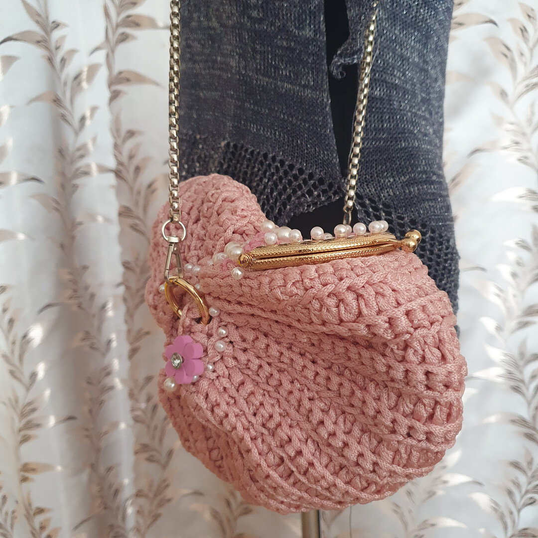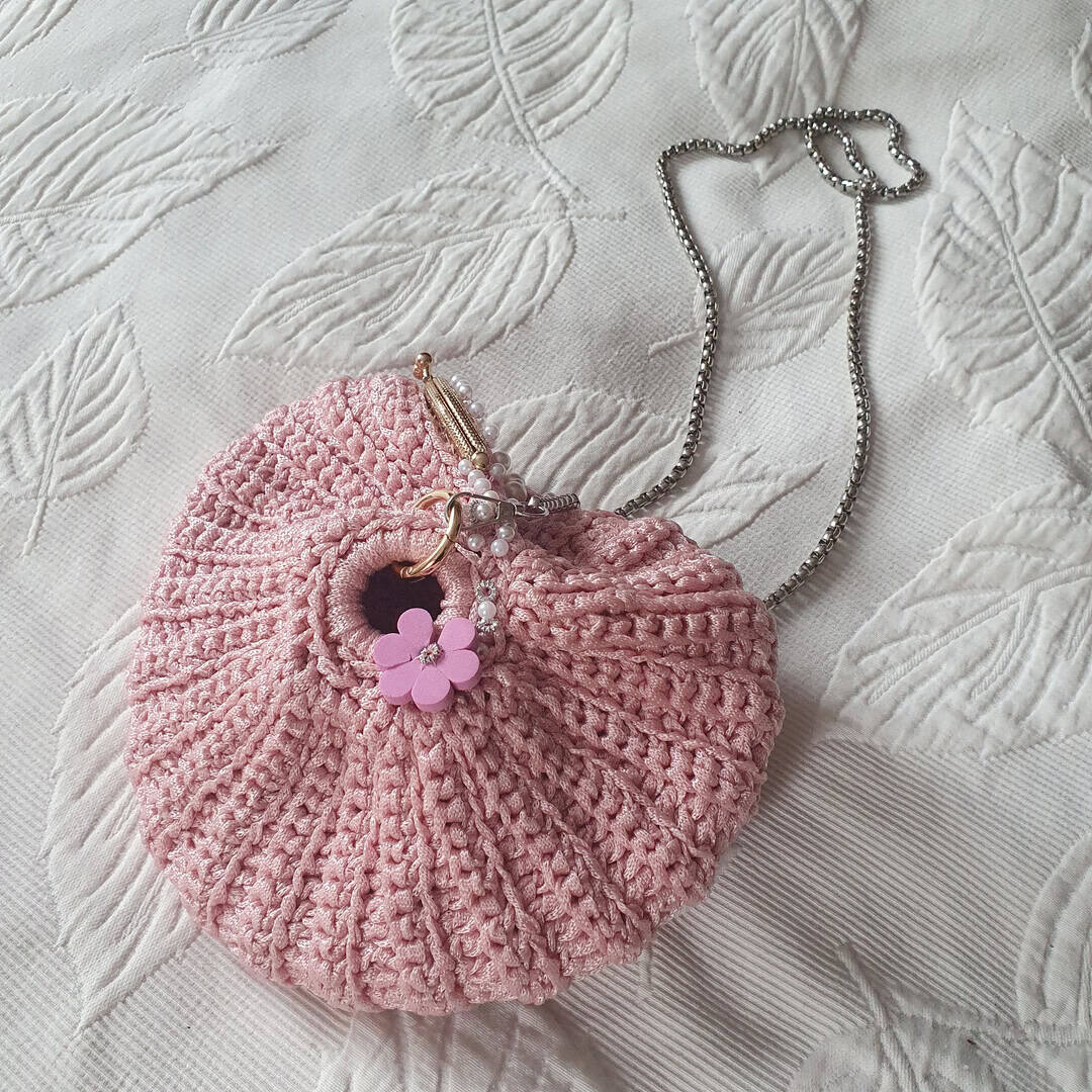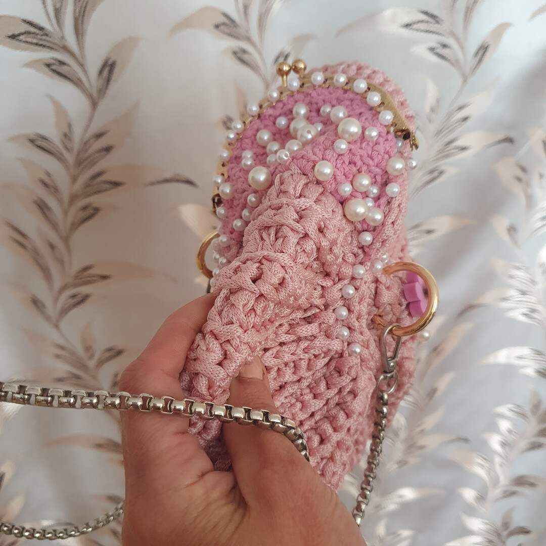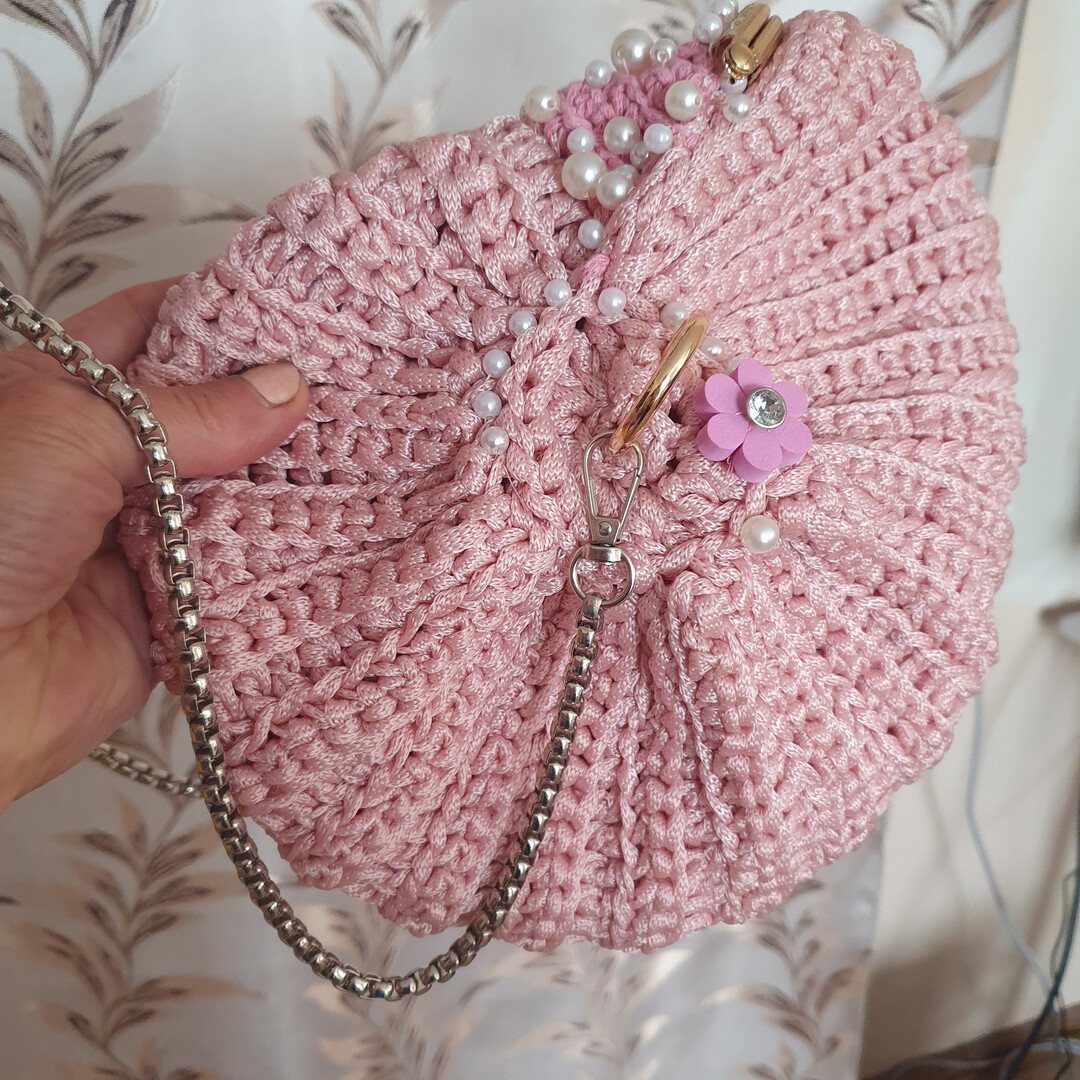 Stylish handmade crochet bag in the shape of a seashell, embroidered with pearls, wallet clasp, on a long metal chain.