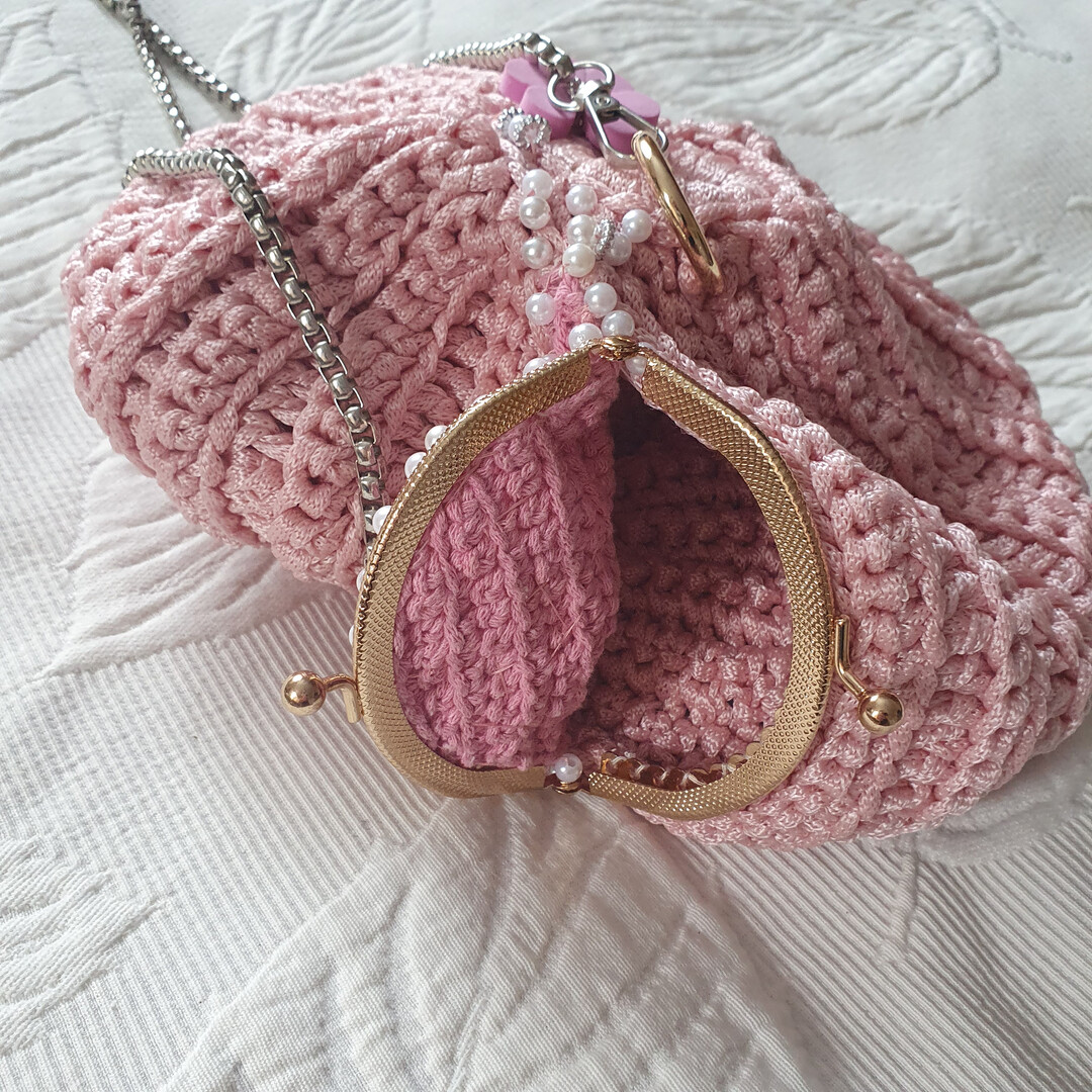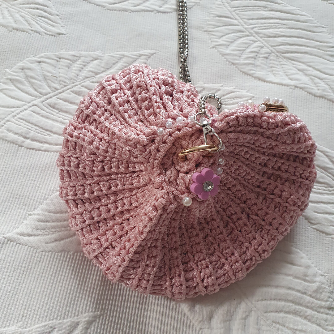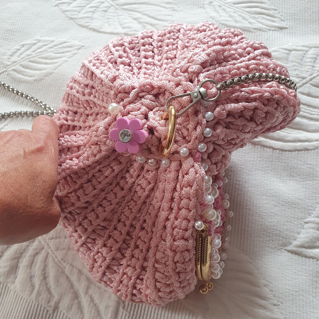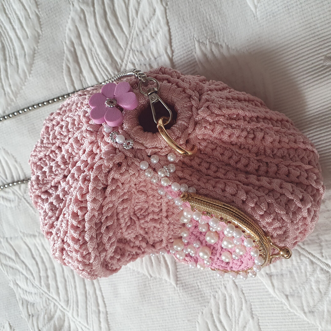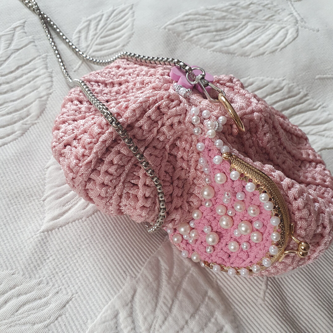 Stylish handmade crochet bag in the shape of a seashell, embroidered with pearls, wallet clasp, on a long metal chain.