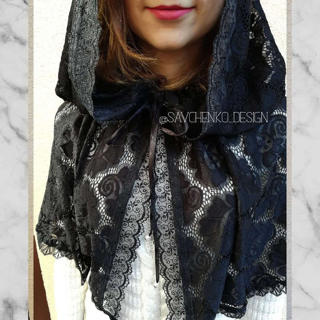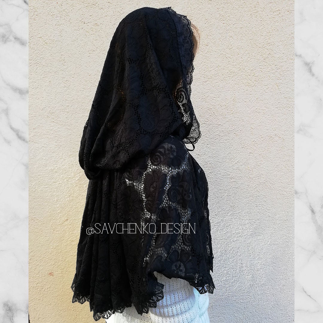 Black cloak with hood with flowers,lace hooded cape,chapel veil for mass, elven cloak,cape with hood,lace chapel veil, church mantilla black
