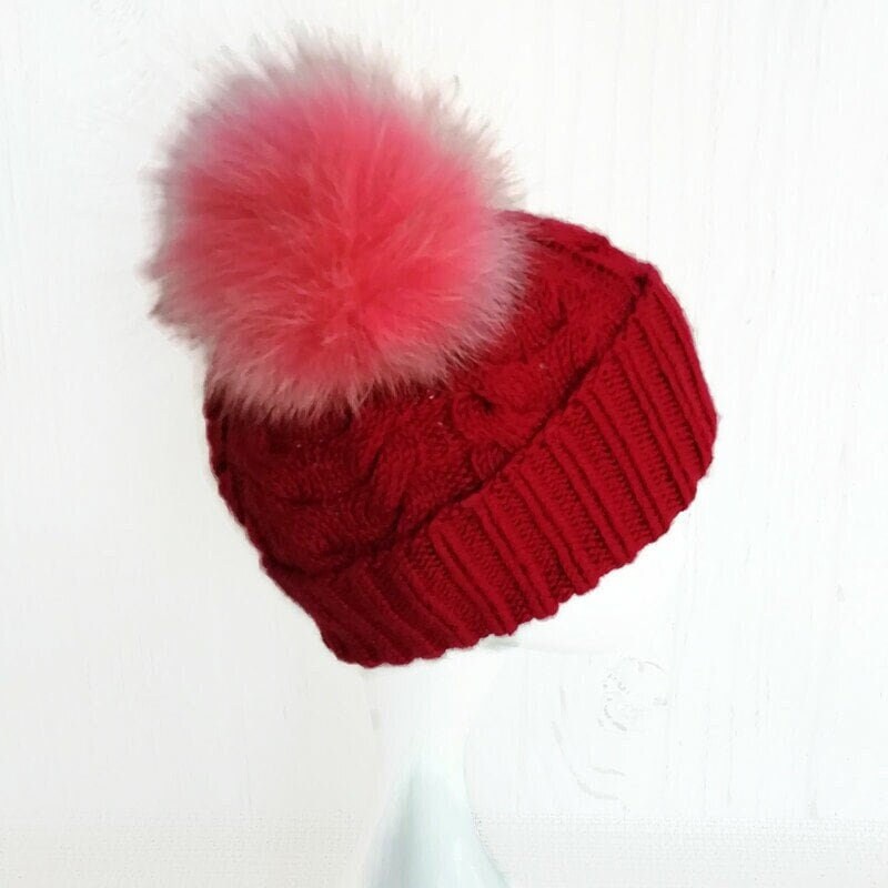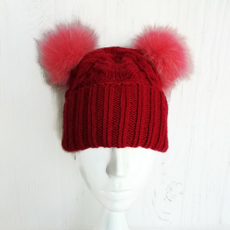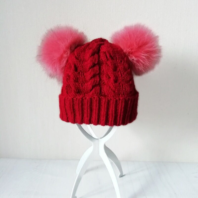 Double pom pom beanie women, Cuffed beanie with poms, Winter hat, Two pompom warm hat
