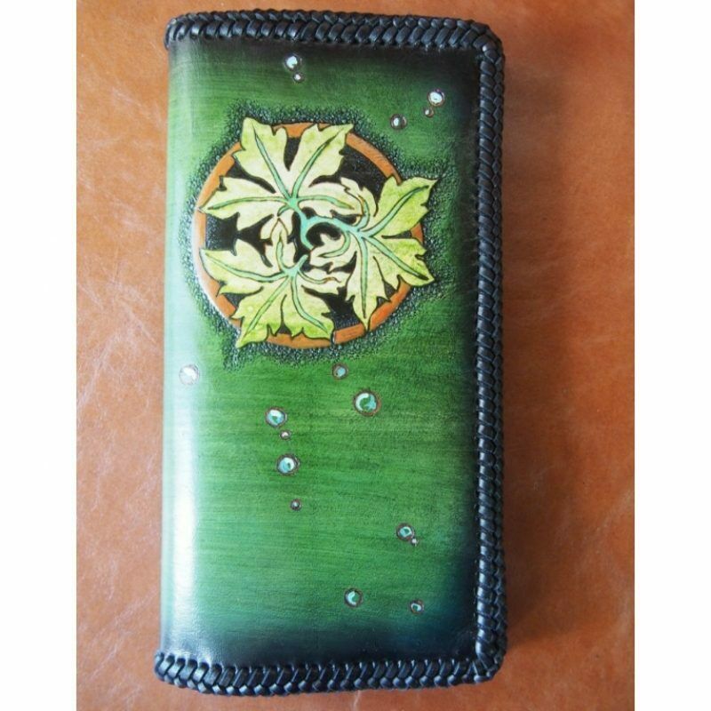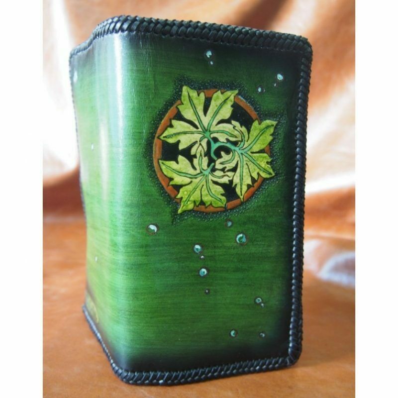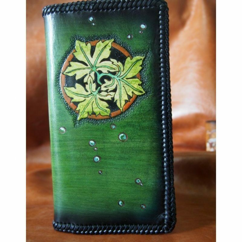 Handmade wallet made of genuine Italian vegetable tanned leather, leather thickness 2 mm. Combined application technique - embossing and pyrography. Wallet painting takes place in several stages, at first it is impregnation with a variety of chemistry, which prevents cracking of the wallet and gives the skin elasticity, then the application of color is an antique gel with a patina effect. After painting, the wallet is varnished to protect the paint from abrasion, and the varnish also protects the wallet from moisture. Perimeter stitching with handmade leather braid.