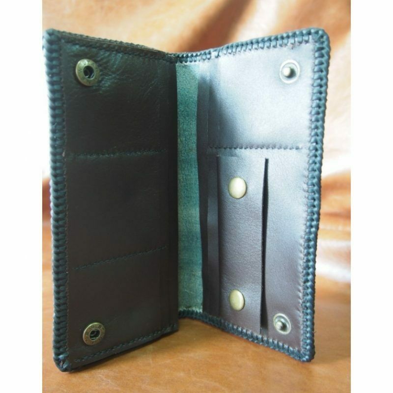 Product size 20 * 10 cm. Inside for the lining is used haberdashery leather, elastic but durable. Two compartments for banknotes, a coin box, 6 compartments for cards, a compartment for a passport. If you wish, you can use such a wallet as well as a phone case.