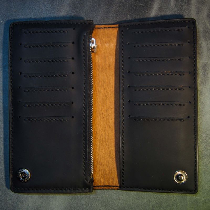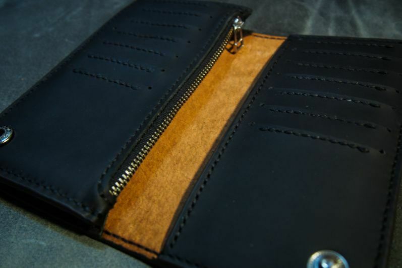 The size of the folded wallet is 20 * 10 cm. Inside the lining is used haberdashery leather, elastic but strong. Two compartments for notes, zip coin box, 14 card slots. We use high quality YKK snakes for our products. The wallet closes with an internal button On any of our wallets, we can install a ring under the carabiner so that it is possible to fasten the wallet to the belt with a chain or leather cord (ordered separately) and safely carry it in the back pocket. The product is coated with varnish, which prevents it from getting dirty, but if the product has been exposed to rain, it must be wiped with a soft cloth and allowed to dry naturally. Do not blow dry. so that you can fasten your wallet to your belt with a chain or leather lanyard (ordered separately) and carry it safely in your back pocket. The product is coated with varnish, which prevents it from getting dirty, but if the product has been exposed to rain, it must be wiped with a soft cloth and allowed to dry naturally. Do not blow dry. so that you can fasten your wallet to your belt with a chain or leather lanyard (ordered separately) and carry it safely in your back pocket. The product is coated with varnish, which prevents it from getting dirty, but if the product has been exposed to rain, it must be wiped with a soft cloth and allowed to dry naturally. Do not blow dry.