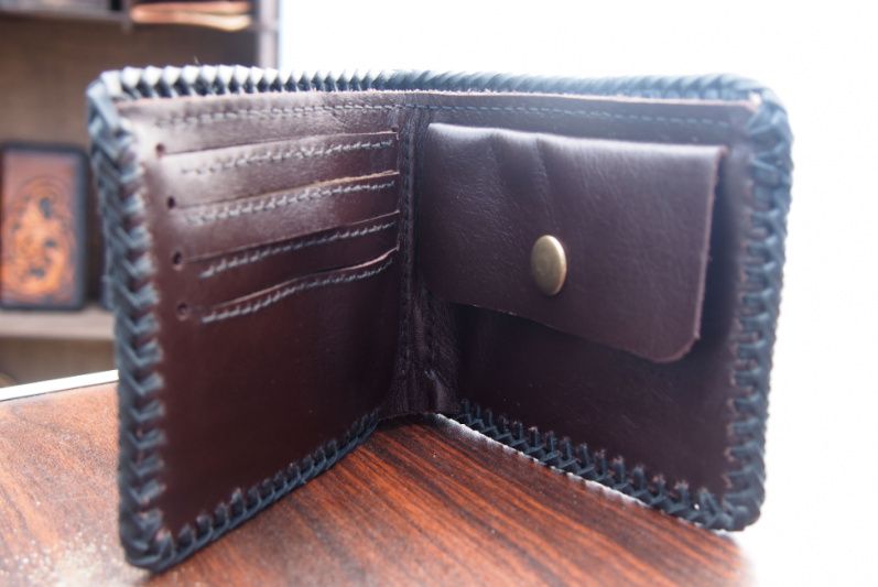 Wallet folded size 9.5 * 12 cm. Inside for the lining used haberdashery leather, elastic, but strong. Two compartments for notes, 8 compartments for cards. The wallet closes with an inner button. (if you wish, you can skip the order). the product is varnished,