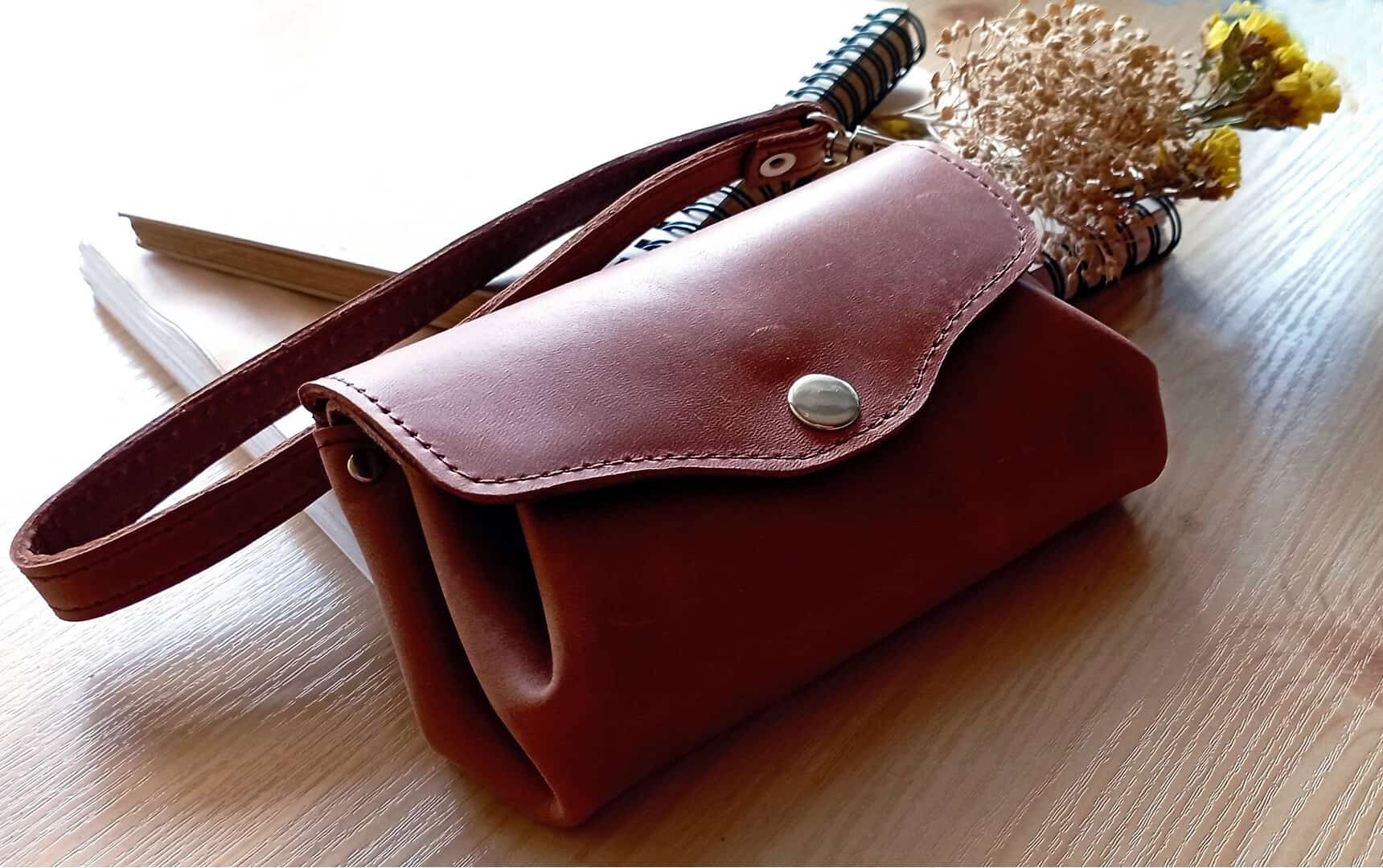 Small, pretty, rounded, compact, but very roomy wallet. Made of thick distressed leather in cognac color.