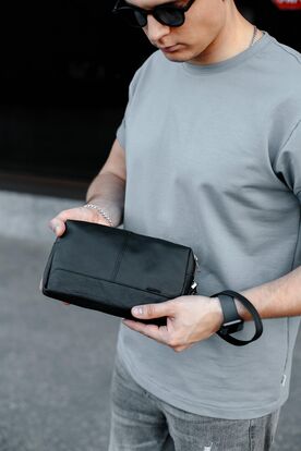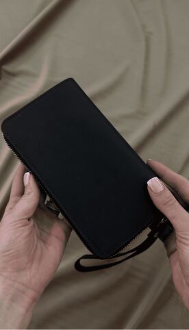 Men’s clutch wallet made of genuine leather — a combination of elegant design, convenience, and practicality in one accessory. Crafted from smooth genuine leather, it features a pleasant texture and durability that only enhances its nobility over time. Thanks to its convenient shape and detachable strap, the clutch is equally comfortable to carry in hand or store in a bag. The versatile black color harmoniously complements any style — from business to casual. STRUCTURE: • one main zippered compartment • three compartments for banknotes • internal zippered coin pocket • six card slots • detachable leather wrist strap with clasp CHARACTERISTICS: Material: genuine leather Leather type: smooth Model type: clutch wallet Hardware: metal Size (H × W × D): 9 × 19 × 3 cm