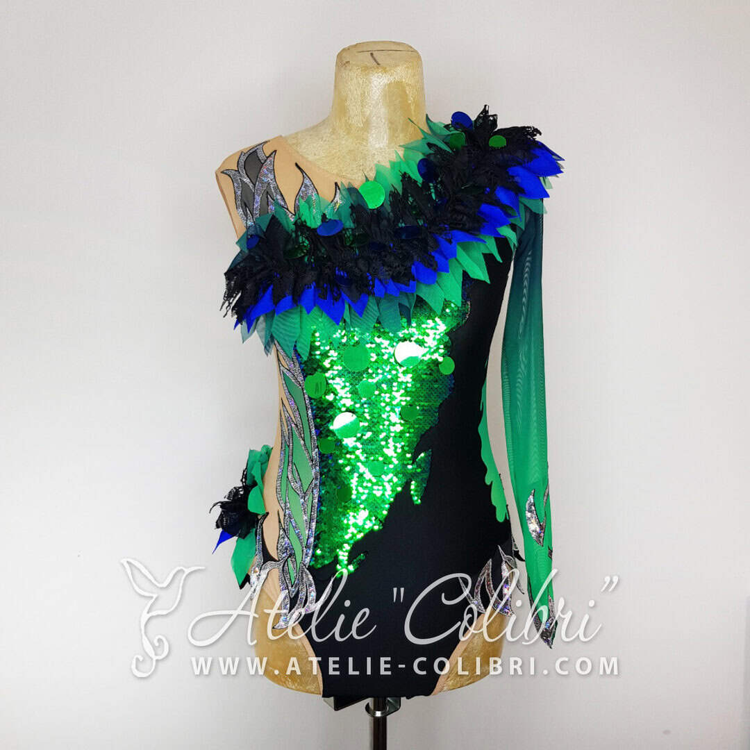 To simulate colour of the body must use : : beige mesh 1 layer Add sleeves : No changes, like the original. Add leggings : No changes, like the original. Includes fabric, sewing, author painting on fabric, applique, rhinestones 100 pieces size ss16 or 10 middle rhinestones (depends on leotard model) and scrunchie.