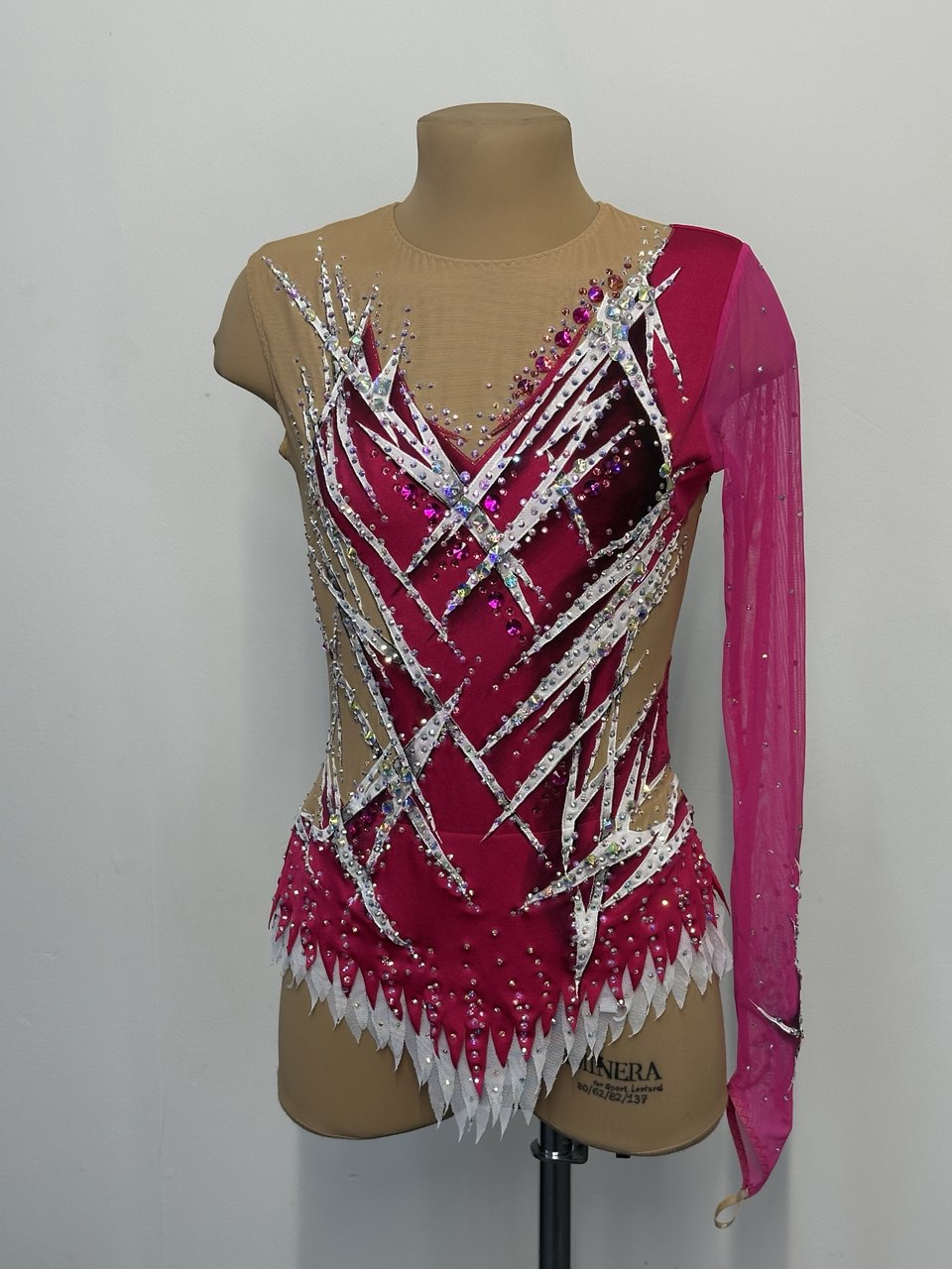 The Rhythmic Gymnastics Leotard ”Bubblegum” RGL_202304 combines a bright bi-elastic supplex fabric – polyamide with the addition of elastane and a beige mesh or fabric to simulate a naked body. Production of materials in Italy, and England. The fabric stretches well and does not hinder movement. The colors are bright and saturated. To give the effect of volume, 2D and 3D applications were used, as well as additional hand-painted details. As our products are not serial and this model is handmade, when sewing there may be a slight difference from the sample in the photo. We can make this leotard according to your individual measurements. If you want to order an exact copy, make the same amount of decor when filling out the order. You can also order any amount of decor. The number of rhinestones and their measurements can be added below. The cost of the model includes fabric, tailoring, original painting on the fabric, applique, and hair elastic. To order, select “standard size” below, or enter your own in “individual measurements”.