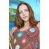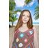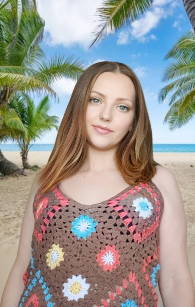 The summer top is crocheted from motifs of colored granny squares, with straps, and thigh-length.