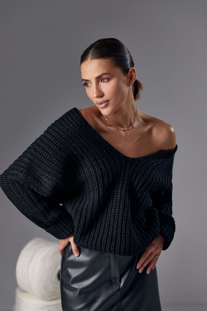 The current oversized jumper is made of warm blended yarn. The model of a laconic cut in a textured, elastic weave has an accent V-shaped neckline in front and on the back.