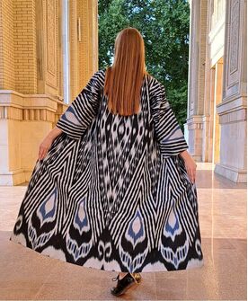 Handwoven Cotton/silk Ikat Chapan ONE SIZE (M/L) ONE SIZE (L/XL) ONE SIZE (XL/XXL) Length 135 cm With  pockets Limited production                                                                                                                                      Chapan 30% silk,70%cotton made from handwoven ikat which are unique (the technology of ikat manufacturing is quite complicated and includes 37 steps) . Ikat is a method of fabric making where the pattern is created prior to weaving through the process of resist-dye of the yarns. Central Asian ikats are warp dyed which means the warp – the lengthwise yarn – is manipulated to create the pattern. The workshop cultivates their own silk – a technique also originated in East Asia and brought to Central Asia through the Silk Road. Silk processing is tedious but the silk yarns give ikat its highly-valued sheen. Before any weaving takes place, a master weaver decides on a pattern from hundreds he has committed to memory while his helpers bundle the yarns and lay them out on a 2×2 meter frame. He then draws the pattern on the outstretched bundles using a sharpened stick dipped in oil and charcoal, marking where the threads are to be bound. His assistant will wrap the bundles at these specific spots using dye-resistant threads of cotton soaked in wax. The yarn bundles are then transferred to the dye bath in the exact order they are on the frame otherwise the pattern would be broken. In the case of multiple color ikat – after each dye-bath, the bundles are left to dry then re-stretched on the frame for the second round of binding and dyeing. The genius of the master craftsman is in strategizing the steps so that the next dye bath adds onto the previous to either forms a pattern in its own shade or combine with the previously dyed parts to make a new color. With natural dyeing, each color may require a different temperature and condition so this is also something to take into account. From the basis of less than five natural colors, the artisans can create a variety of colors and an unlimited possibility of pattern combination. The points where the yarn bundles are tied to the 2×2 meter frame result in a line repeating every two meters or so in the final woven fabric. This line distinguishes handmade from machine-made ikats and is an inevitable feature of traditional ikat weaving. This process produces no more than 40 inches of fabric a day.