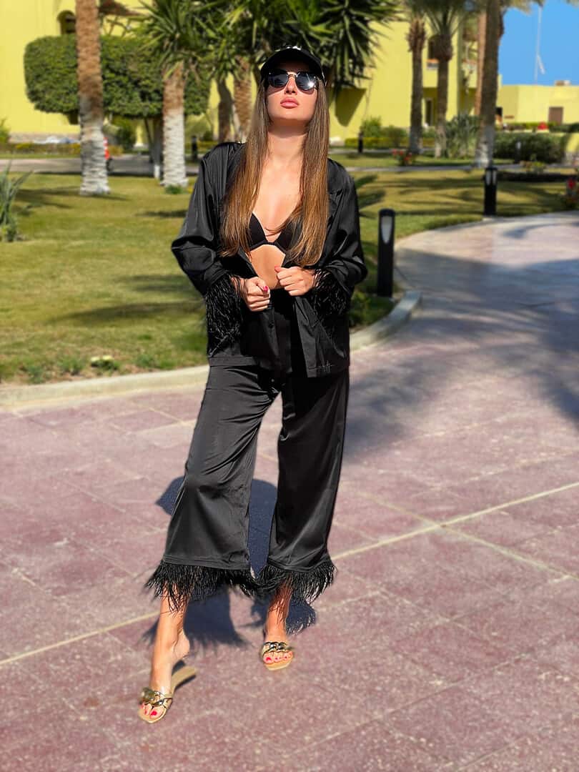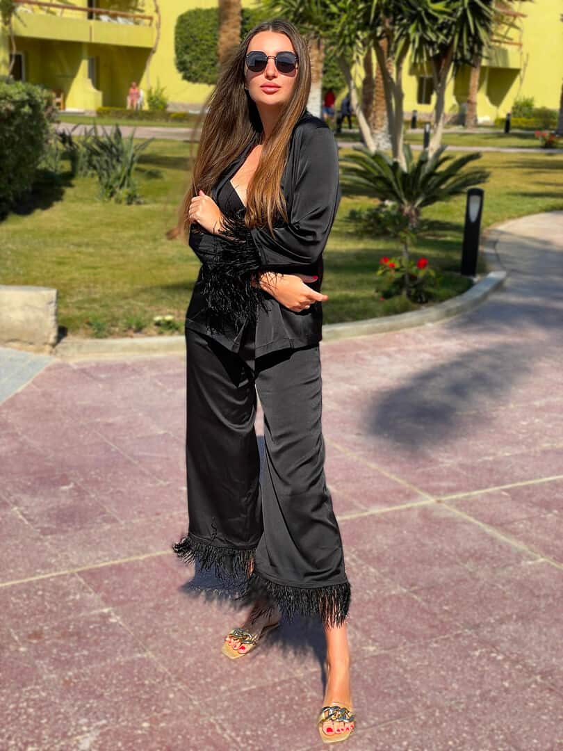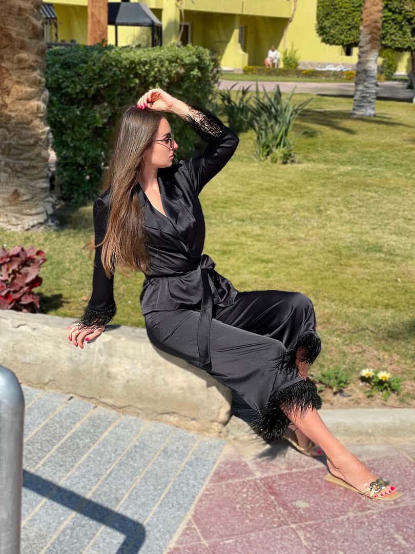 Pajama style suit, Silk satin pajamas, Versatile feathered pajama suit, morning outfit, Bride Prep ,Feather Pajamas, black pajamas