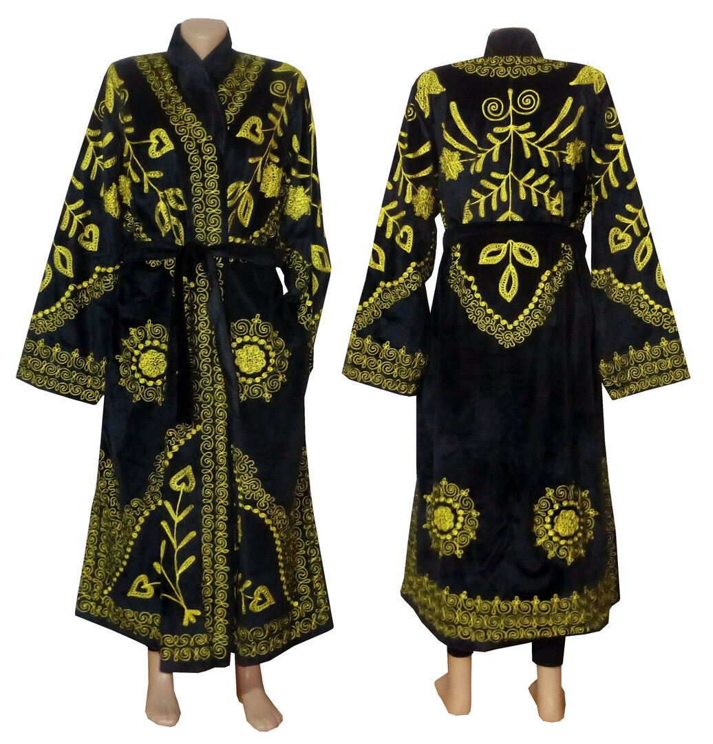 plus size fully silk embroidered black silk velvet caftan uzbek chapan