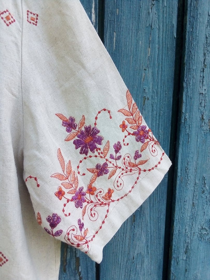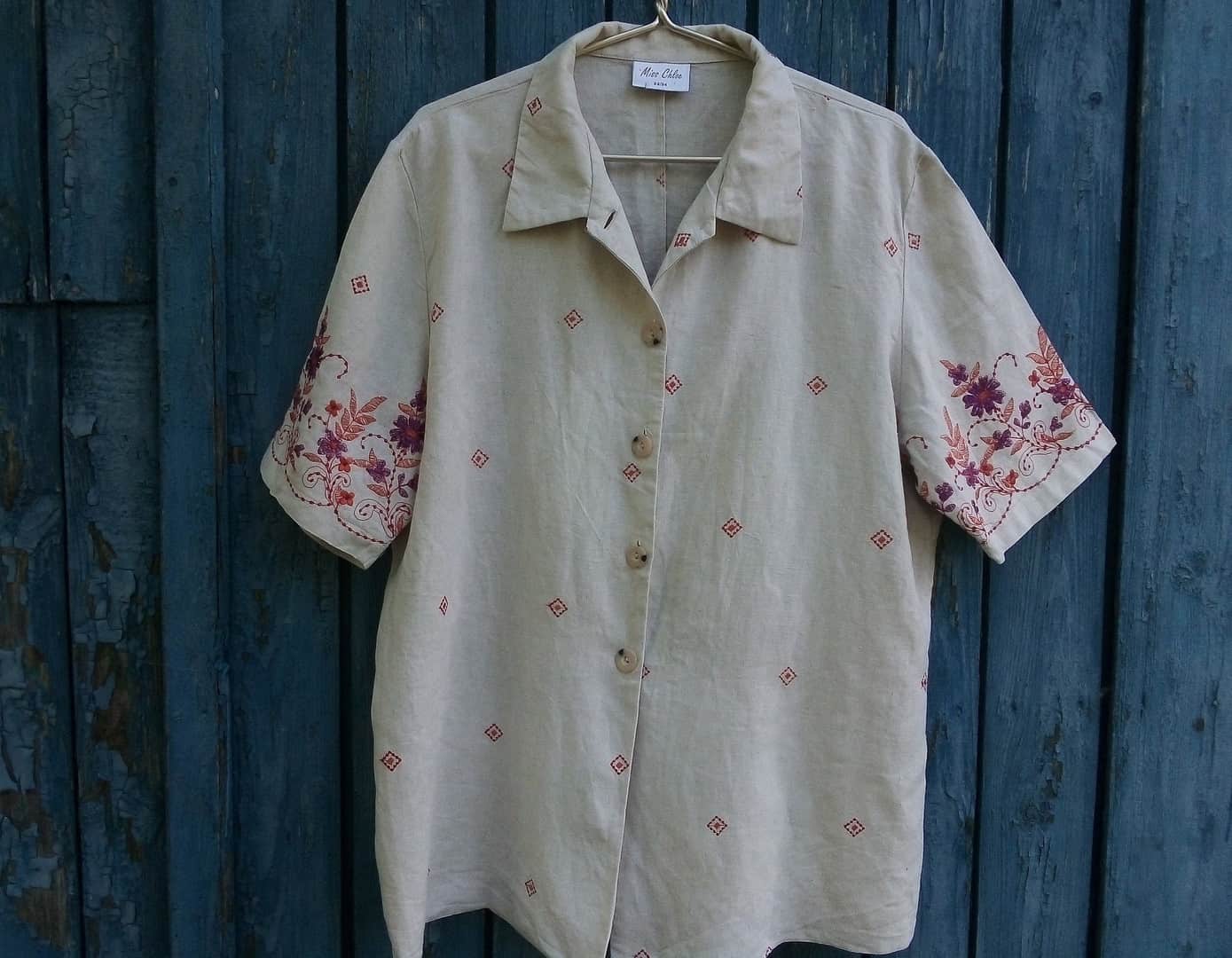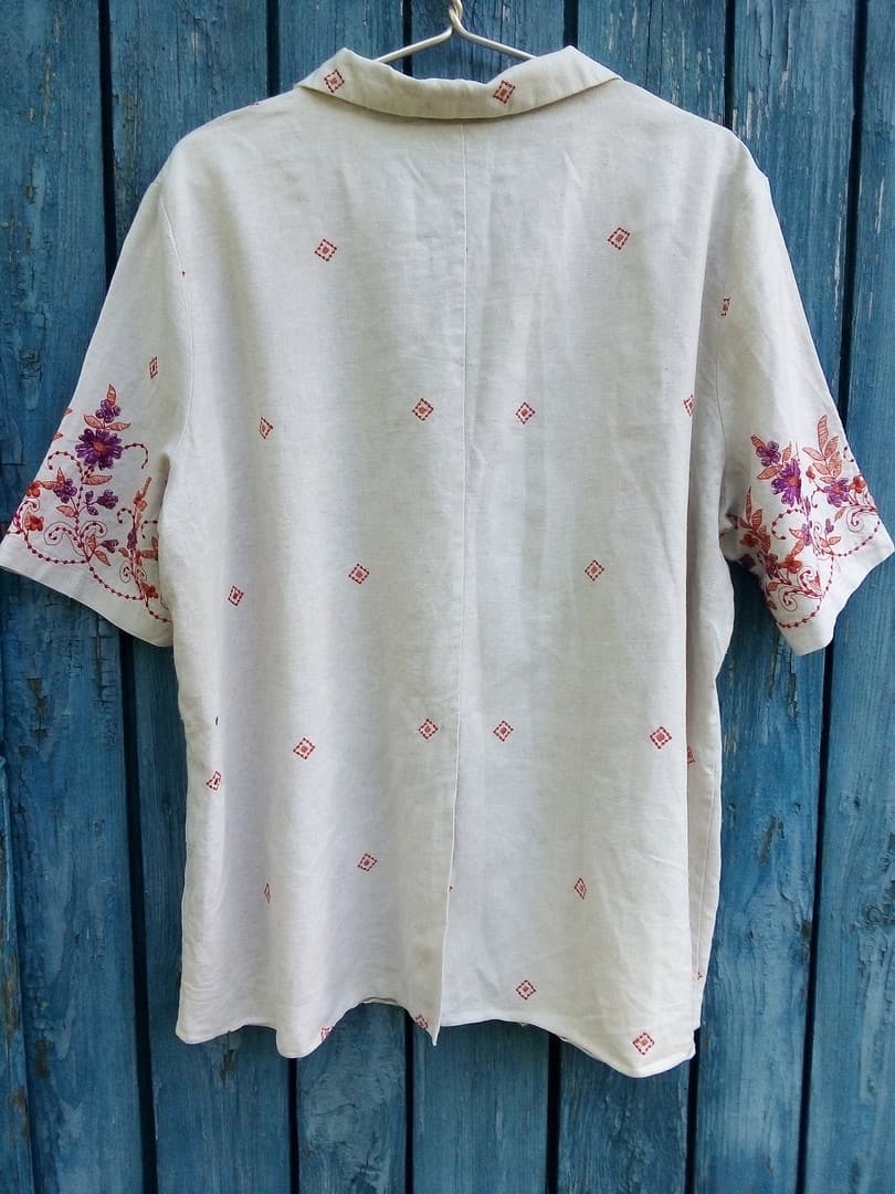 Plus size Linen embroidered shirt Women's Boho Floral embroidery blouse Ecru Summer ladies shirt