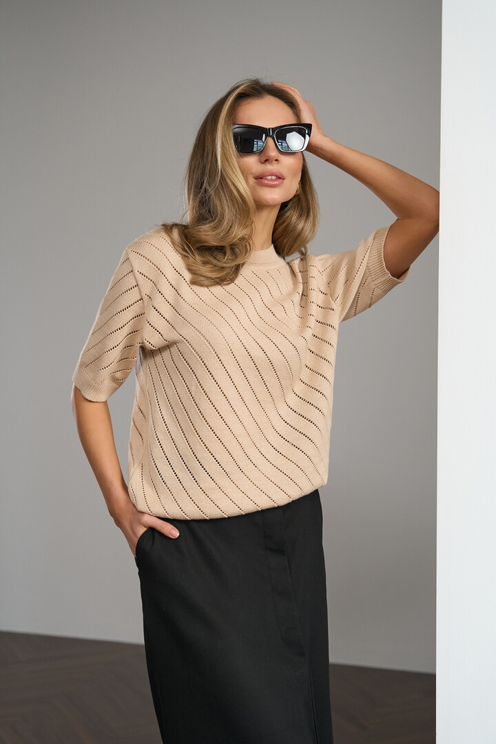 The elegant top is made of natural, body-pleasing cotton yarn with the addition of viscose.