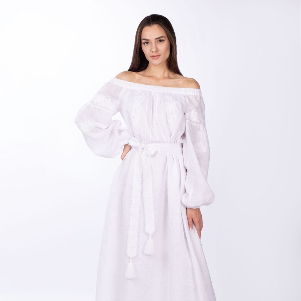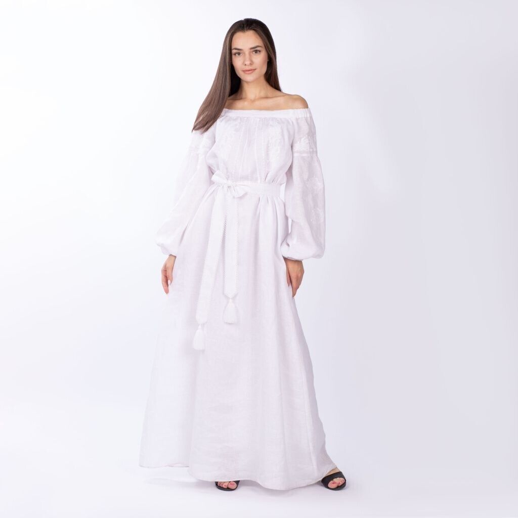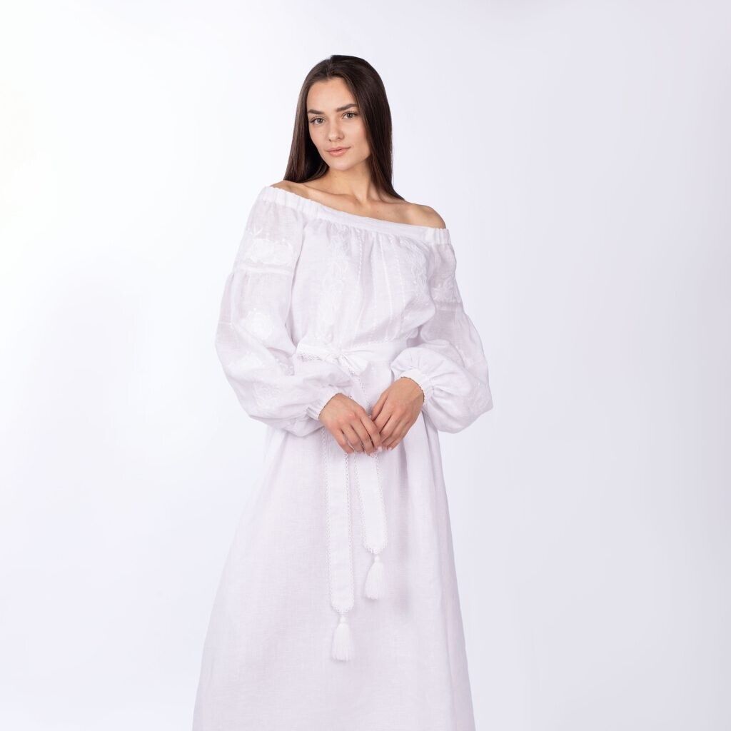 The lapel, back and sleeves of cloth are embroidered with a snow-white dew pattern on a natural white linen.