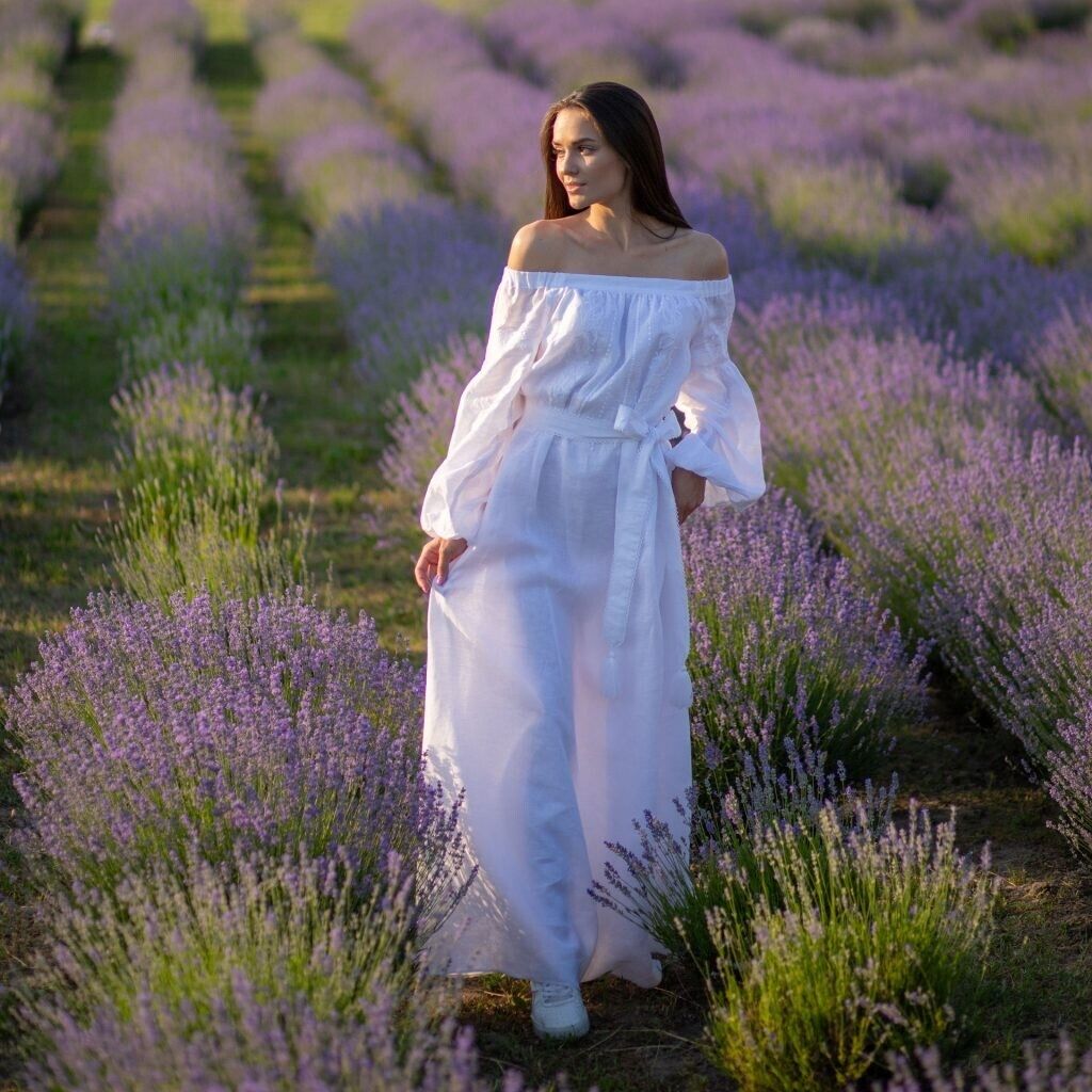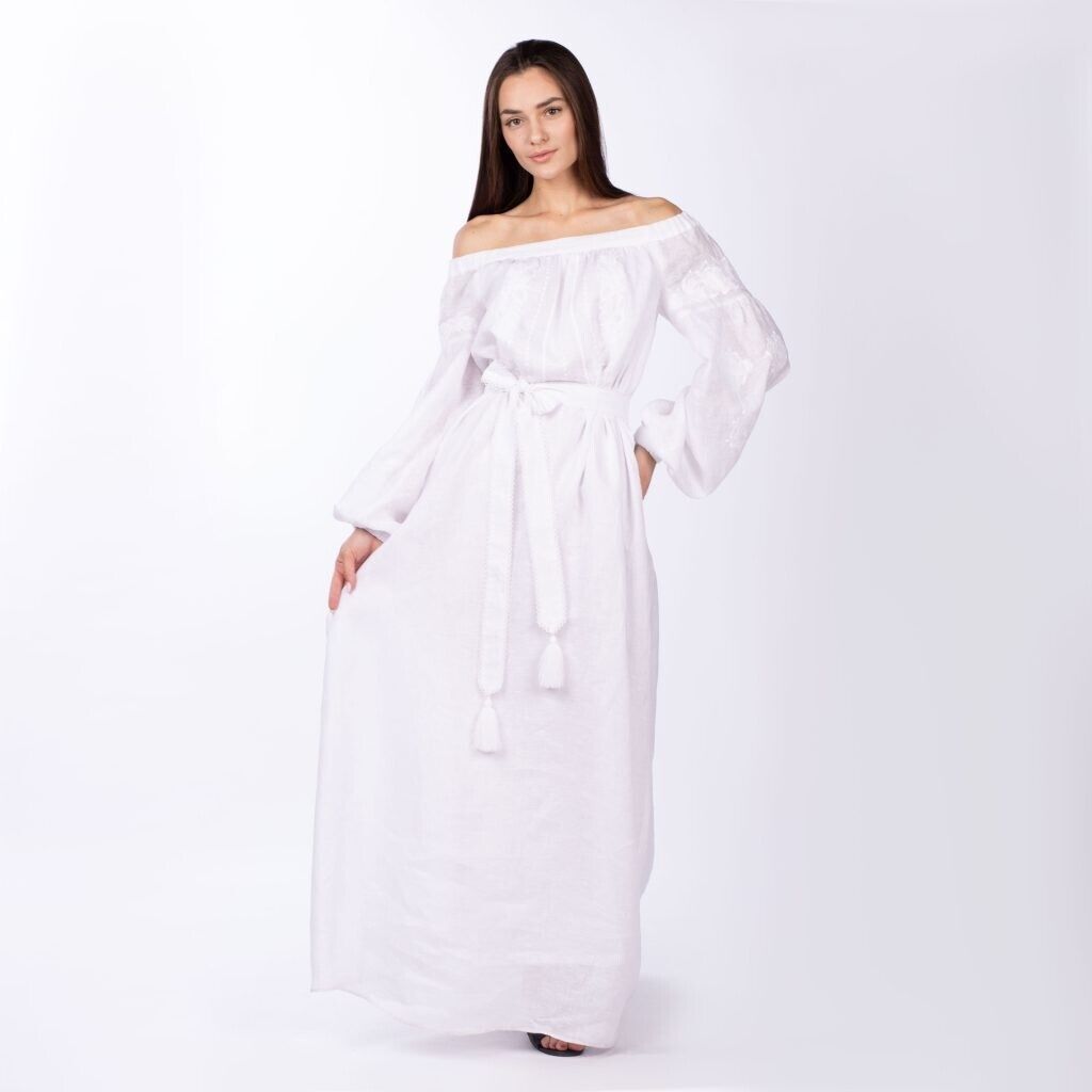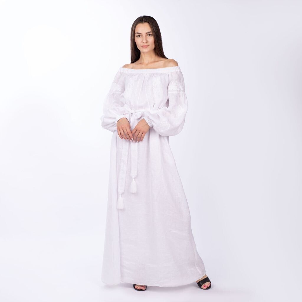 The lapel, back and sleeves of cloth are embroidered with a snow-white dew pattern on a natural white linen.