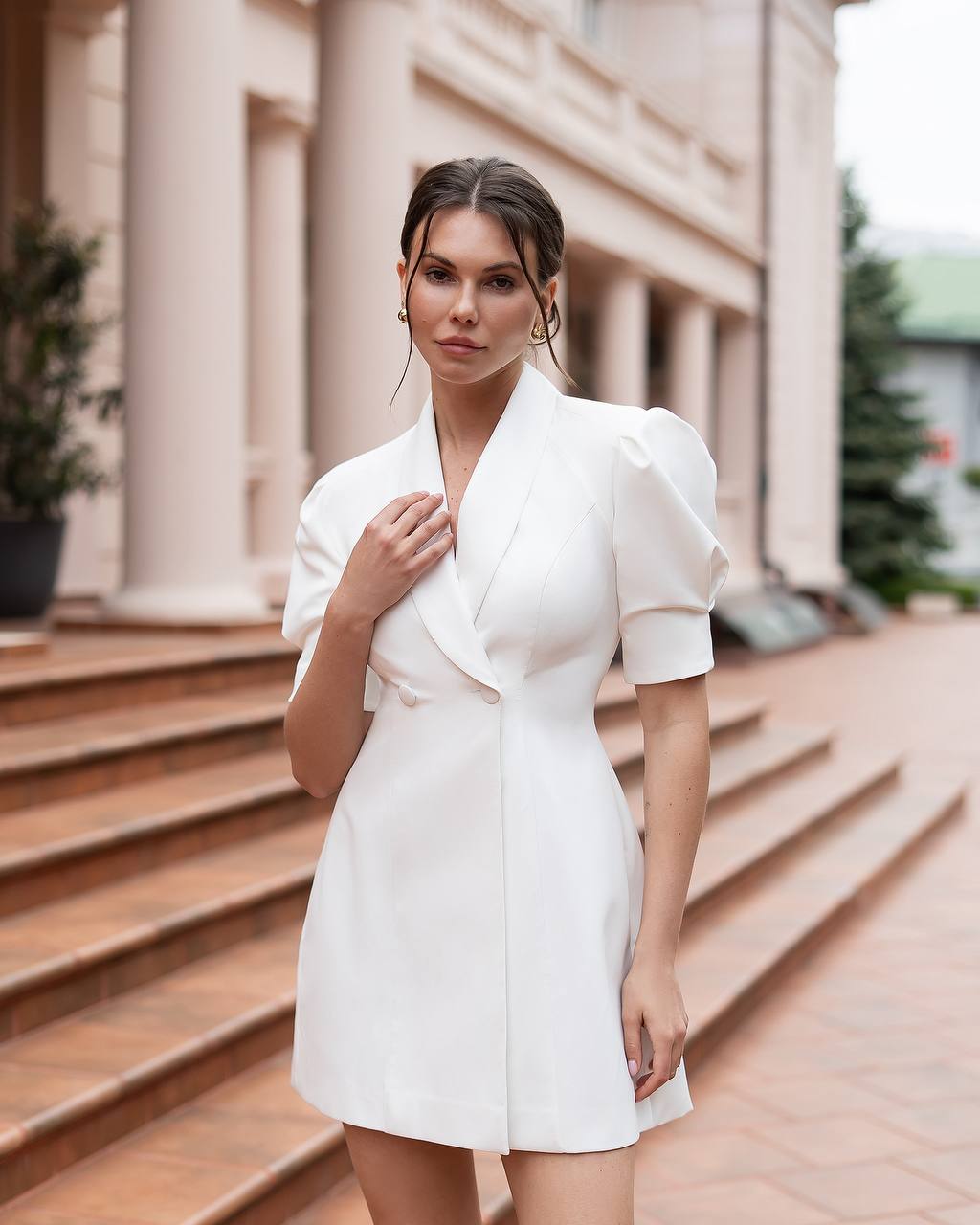 Elegant white blazer dress with short sleeves and a tailored silhouette. The modern double-breasted design creates a feminine and sophisticated look while keeping it stylish and minimal. Perfect choice for a wedding, engagement, rehearsal dinner, graduation, or special evening out.