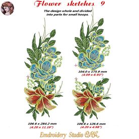 Flower sketches 9 - it's machine embroidery designs made by Oksana Vushkan. Please note: This is digital files for embroidery machine. You must have an embroidery machine and the software needed to transfer their from your computer to the machine to use this files.     Designs are suitable for youth and women's clothing, bedding, haberdashery, tablecloths and napkins, embroidered shirts The design whole and divided into parts for small hoops. The dimensions of the designs divided into parts are indicated in the additional photos in the assembly diagram. Design parameters (whole for large hoop): OV_floral sketches_9_1 Size: 106.6 x 284.2 mm (4.20 x 11.19") Stitches: 38825 Colors: 10/11    I emphasize that experience is needed to assemble a design from parts,  but I also believe that beginners who want to learn how to assemble large designs from parts should try and gain experience in practice. There is no need to be afraid, you need to learn.  The delivery set includes designs in machine formats: DST, XXX, JEF, HUS, PES, PEC, VIP, VP3, EXP , assembly instructions in English, assembly diagrams, files with design parameters and color palette, photos, as well as templates for printing on a printer. You should be able to unpack the zip archive.   - It is your responsibility to observe the sizing of designs to insure compatibility with your machine. Even if the design is offered in your Format it is not a guarantee that the designs will be size compatible. You should know the size of the embroidery field of your embroidery machine (not to be confused with the size of the hoops ). The size of the field is the maximum size of the embroidery that can be embroidered on Your embroidery machine. If you have any questions about the size of the design before you make a purchase, it is better to specify whether the design will fit into Your hoops or not. To do this, you need to tell the size of Your hoops and the format you need.   - I never give away or sell EMB working files for any money, only machine formats are sold. If your format is not in the list of suggested ones, I will try to convert the design into the desired one, provided that I have such a converter. Resizing or editing of the designs is not recommended and I can not guarantee the quality of the designs if you alter them in any way.  - All my designs are tested on embroidery machines before going on sale. I do not specifically create designs for leather and stretch materials and do not test them. Samples are embroidered on cotton fabrics, sometimes on fabrics with slight stretch, such as gabardine. Everyone's experience with embroidery is different. I focus on myself. If I achieved the desired result in the sample - the design is not pulled together, the fabric is not unraveling, there are no breaks in it, the outline is in its place, then you should have the same result. Failures may be due to a lack of experience in embroidery, improper stabilization, inappropriate material for a given design, or incorrectly adjusted technique.  - I recommend making a sample on the same or similar material before embroidering a design on a product. There are materials that can behave unpredictably in embroidery. From practice, I know that several materials from the same manufacturer, with the same price, and the same name may differ in quality. One material is more elastic, the other is flabby, loose, and of course they will behave differently in embroidery. Embroidering samples will save you from many problems and disappointments.  - What is zip files, how to open an embroidery file on your computer, how to embroider complex designs. The answers to these questions, see the additional photos to this product.  Purchased designs can be embroidered on items for personal use or for small commercial purposes, provided that the source is indicated as "Embroidery Design by "Embroidery Studio ONA". You may not redistribute this electronic product free of charge or resell it to third parties.  I hope You enjoy my design. I would be glad to receive your feedback on my designs.    Thanks for visiting my shop