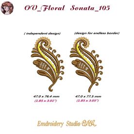 " Floral Sonata_105 " -  it's machine embroidery design  Of series "Floral Sonata" made by Oksana Vushkan.  Please note: This is digital file for embroidery machine. You must have an embroidery machine and the software needed to transfer it from your computer to the machine to use this file. This design is manually digitized by myself. No auto digitizing software is used. The designs parameters:  OV_Floral Sonata_105_1  ( independent design) Size: 47.0 x 76.4 mm (1.85 x 3.01") Stitches: 4047 Colors: 3 ------------------------------------------- OV_Floral Sonata_105_2  (design for endless border) Size: 47.0 x 77.5 mm (1.85 x 3.05") Stitches: 4017 Colors: 3  The border is assembled using a non-woven template. How to make a template, see "Instructions for connecting designs" which comes with the set. Single leaves are good because using non-woven templates and turning each leaf little by little relative to the previous one, you can slightly round the border line.  The delivery set includes designs in machine formats: DST, XXX, JEF, HUS, PES, PEC, VIP, VP3, EXP , assembly instructions in English, files with design parameters and color palette, photos, as well as templates for printing on a printer. You should be able to unpack the zip archive.  - It is your responsibility to observe the sizing of designs to insure compatibility with your machine. Even if the design is offered in your Format it is not a guarantee that the designs will be size compatible. You should know the size of the embroidery field of your embroidery machine (not to be confused with the size of the hoops ). The size of the field is the maximum size of the embroidery that can be embroidered on Your embroidery machine. If you have any questions about the size of the design before you make a purchase, it is better to specify whether the design will fit into Your hoops or not. To do this, you need to tell the size of Your hoops and the format you need.   - I never give away or sell EMB working files for any money, only machine formats are sold. If your format is not in the list of suggested ones, I will try to convert the design into the desired one, provided that I have such a converter. Resizing or editing of the designs is not recommended and I can not guarantee the quality of the designs if you alter them in any way. The collection  "Floral Sonata" will grow!  - All my designs are tested on embroidery machines before going on sale. I do not specifically create designs for leather and stretch materials and do not test them. Samples are embroidered on cotton fabrics, sometimes on fabrics with slight stretch, such as gabardine. Everyone's experience with embroidery is different. I focus on myself. If I achieved the desired result in the sample - the design is not pulled together, the fabric is not unraveling, there are no breaks in it, the outline is in its place, then you should have the same result. Failures may be due to a lack of experience in embroidery, improper stabilization, inappropriate material for a given design, or incorrectly adjusted technique.  - I recommend making a sample on the same or similar material before embroidering a design on a product. There are materials that can behave unpredictably in embroidery. From practice, I know that several materials from the same manufacturer, with the same price, and the same name may differ in quality. One material is more elastic, the other is flabby, loose, and of course they will behave differently in embroidery. Embroidering samples will save you from many problems and disappointments.  - What is zip files, how to open an embroidery file on your computer, how to embroider complex designs. The answers to these questions, see the additional photos to this product.  Purchased designs can be embroidered on items for personal use or for small commercial purposes, provided that the source is indicated as "Embroidery Design by "Embroidery Studio ONA". You may not redistribute this electronic product free of charge or resell it to third parties.  I hope You enjoy my design. I would be glad to receive your feedback on my designs. Thanks for visiting my shop