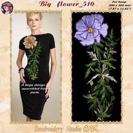 "Big flower_510" - it's machine embroidery designs made by Oksana Vushkan. Please note: This is digital file for embroidery machine. You must have an embroidery machine and the software needed to transfer it from your computer to the machine to use this file. This design is manually digitized by myself. No auto digitizing software is used.  The design is delicate, not dense. Suitable for decorating clothing and interior. A large design is assembled from parts, fits hoops 200 x 300 mm (7,87 x 11,81") and larger their. ----------------- Can be purchased separately in the store Big flower_383 , size 195 x 383 mm (7.68 x 15.08") for hoops 150 x 240 mm (5.90 x 9.45") and larger them ----------------      I emphasize that experience is needed to assemble a design from parts, but I also believe that beginners who want to learn how to assemble large designs from parts should try and gain experience in practice. There is no need to be afraid, you need to learn. Design parameters (Assembled design size): Size: 270x 510 mm (7.87 x 20.08") Stitches: 98989 Colors: 11 --------------------------------------------------- The design is divided into 3 part. The dimensions of each part and assembly diagram are shown in the photo. Assembly instructions are also in the photo. Be sure to read it before purchasing. --------------------------------------------------- Parameters of each part separately: 1. Big flower_510_1 Size: 173.1 x 226.6 mm (6.81 x 8.92") Stitches: 26858 Colors: 4 --------------------------------------------------- 2. Big flower_510_2 Size: 180.2 x 282.4 mm (7.09 x 11.12") Stitches: 25894 Colors: 4/5 -------------------------------------------------- 3. Big flower_510_3 Size: 183.4 x 157.8 mm (7.22 x 6.21") Stitches: 43766 Colors: 8/10     The delivery set includes designs in machine formats: DST, XXX, JEF, HUS, PES, PEC, VIP, VP3, EXP, assembly instructions in English, assembly diagram, Big flower (recommendations), files with design parameters and color palette, photos, as well as templates for printing on a printer. You should be able to unpack the zip archive   - It is your responsibility to observe the sizing of designs to insure compatibility with your machine. Even if the design is offered in your Format it is not a guarantee that the designs will be size compatible. You should know the size of the embroidery field of your embroidery machine (not to be confused with the size of the hoops ). The size of the field is the maximum size of the embroidery that can be embroidered on Your embroidery machine. If you have any questions about the size of the design before you make a purchase, it is better to specify whether the design will fit into Your hoops or not. To do this, you need to tell the size of Your hoops and the format you need.   - I never give away or sell EMB working files for any money, only machine formats are sold. If your format is not in the list of suggested ones, I will try to convert the design into the desired one, provided that I have such a converter. Resizing or editing of the designs is not recommended and I can not guarantee the quality of the designs if you alter them in any way.  - All my designs are tested on embroidery machines before going on sale. I do not specifically create designs for leather and stretch materials and do not test them. Samples are embroidered on cotton fabrics, sometimes on fabrics with slight stretch, such as gabardine. Everyone's experience with embroidery is different. I focus on myself. If I achieved the desired result in the sample - the design is not pulled together, the fabric is not unraveling, there are no breaks in it, the outline is in its place, then you should have the same result. Failures may be due to a lack of experience in embroidery, improper stabilization, inappropriate material for a given design, or incorrectly adjusted technique.  - I recommend making a sample on the same or similar material before embroidering a design on a product. There are materials that can behave unpredictably in embroidery. From practice, I know that several materials from the same manufacturer, with the same price, and the same name may differ in quality. One material is more elastic, the other is flabby, loose, and of course they will behave differently in embroidery. Embroidering samples will save you from many problems and disappointments.  - What is zip files, how to open an embroidery file on your computer, how to embroider complex designs. The answers to these questions, see the additional photos to this product.  Purchased designs can be embroidered on items for personal use or for small commercial purposes, provided that the source is indicated as "Embroidery Design by "Embroidery Studio ONA". You may not redistribute this electronic product free of charge or resell it to third parties.  I hope You enjoy my design. I would be glad to receive your feedback on my designs.    Thanks for visiting my shop