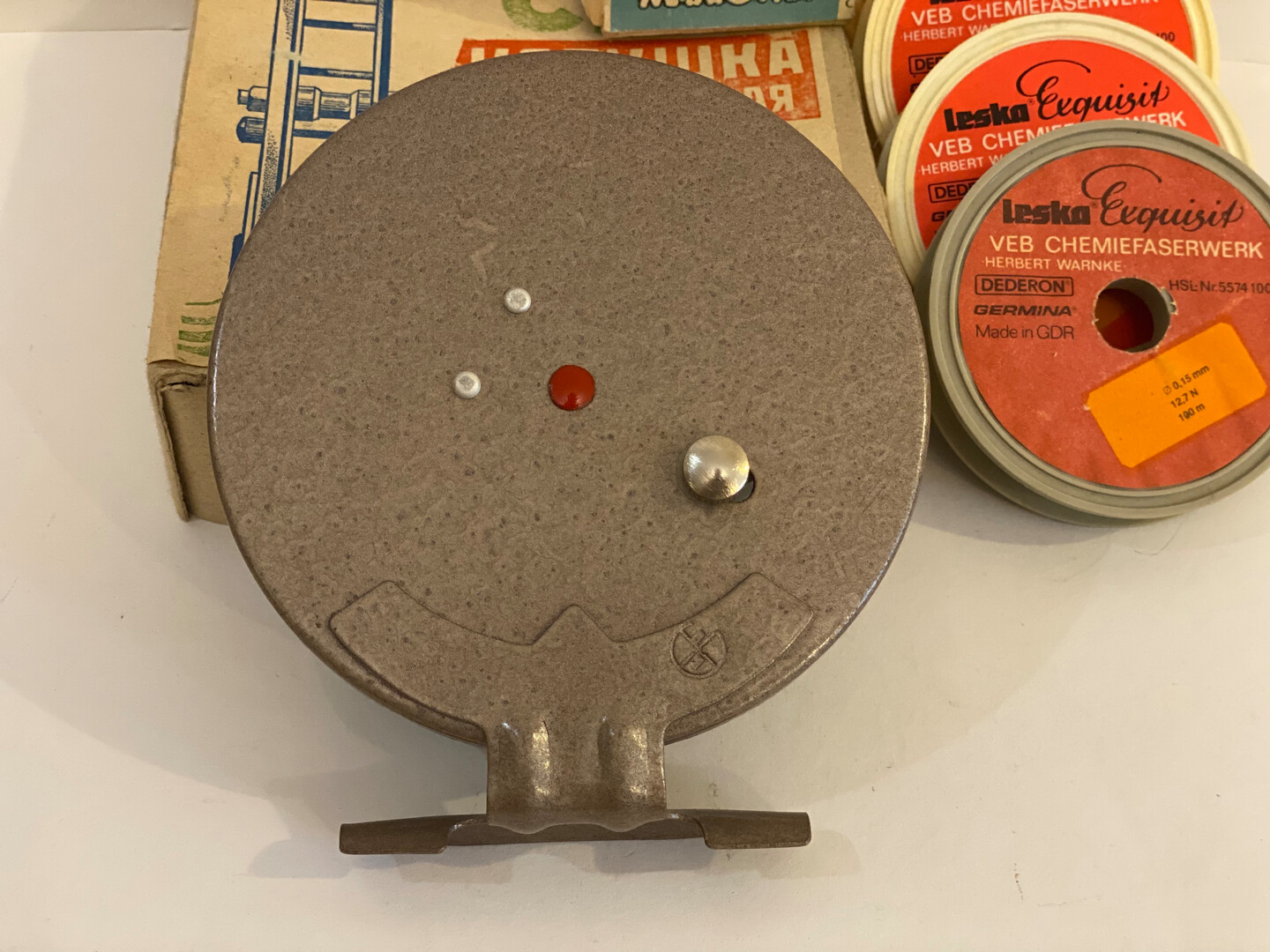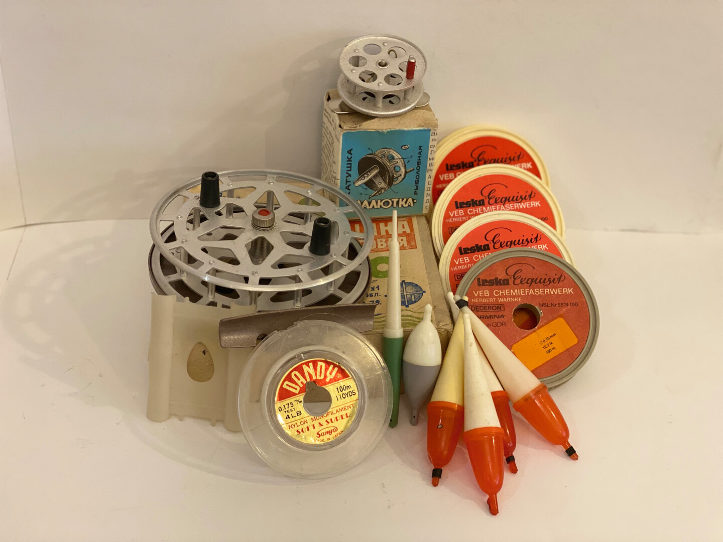 Vintage fisherman set: old spinning coils, floats, fishing line, fishing reels, hooks for fishing