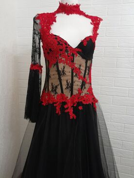 This dance dress is made of black guipure and jersey. The material used is very elastic, so you will feel comfortable in active dance movements.