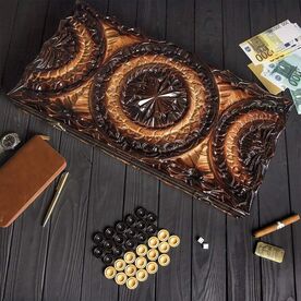 Open size 60 x 60 cm Backgammon comes with chips (15+15) and dice Only handmade. Original carving design Material linden tree Modern status gift Woodcarving.
