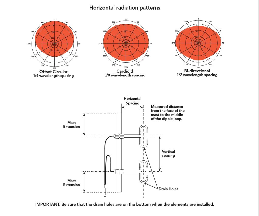 Install the supplied hardware exactly as shown in the photo. Colored markers on each dipole indicate upward direction. Accordingly, the drainage holes at the end of the antennas should point downward.