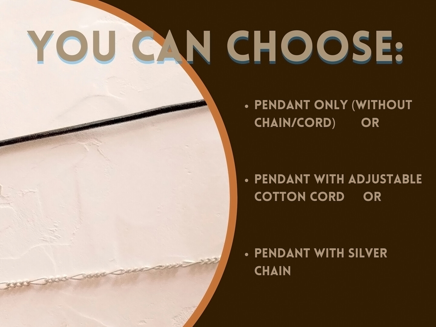 You can choose: 1) only pendant without chain or cord; 2) pendant with adjustable black cotton cord; 3) pendant with silver chain. There are variations of silver chain length: 1) 16 inches (40 cm), 2) 20 inches (50 cm), 3) 24 inches (60 cm), 4) 26 inches (66 cm).