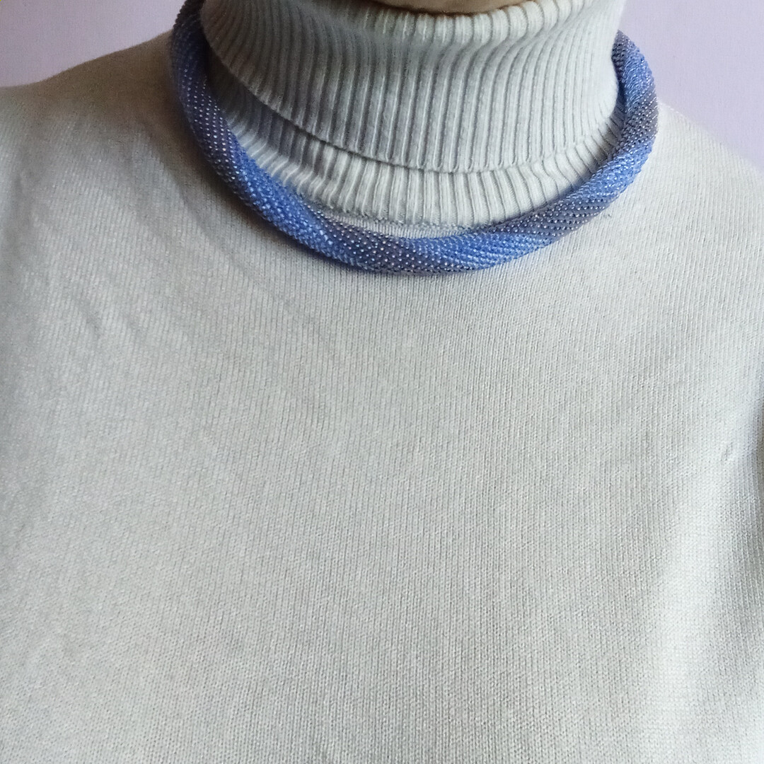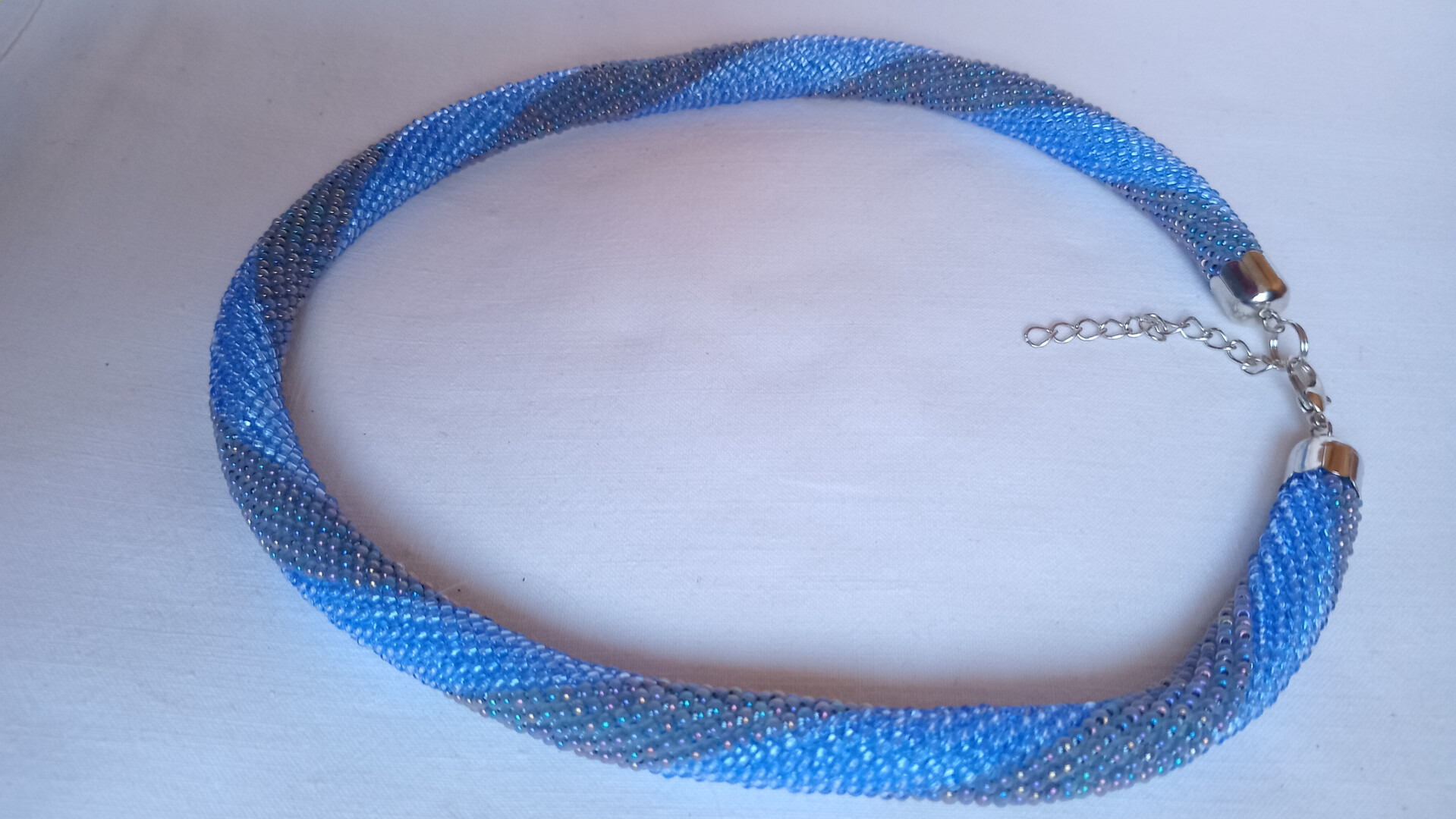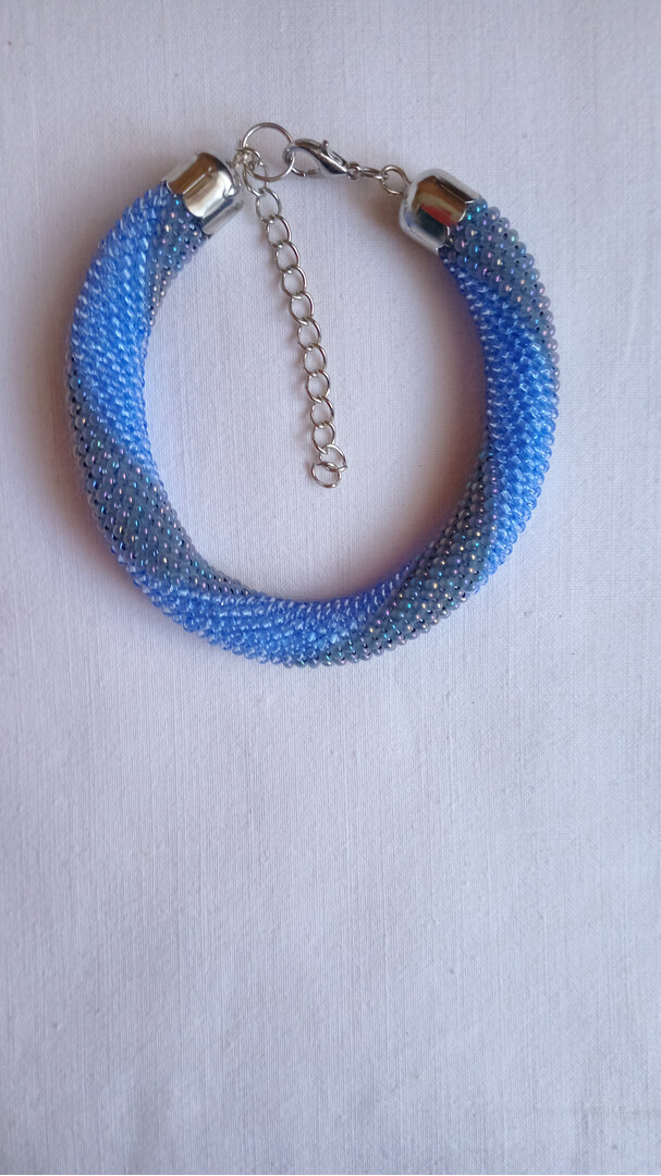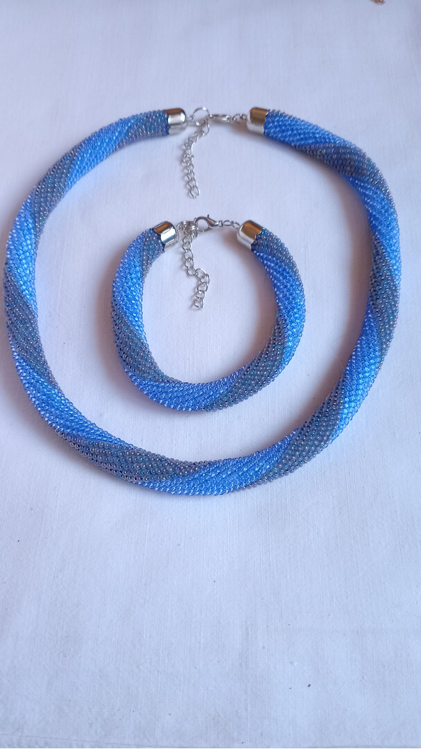 Enhance your style with this exquisite set featuring a crocheted bracelet and necklace. Crafted with sky blue transparent and gray blue iridescent beads, this stunning duo will add elegance to any outfit. Perfect for layering or wearing solo, this set is a must-have addition to your jewelry collection.