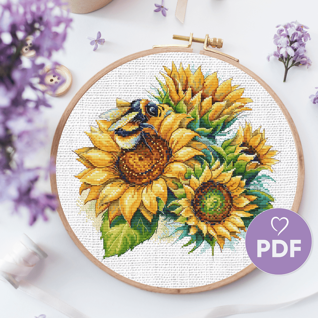 Sunflowers and Bumblebee Cross Stitch Pattern PDF – Cute Floral Cross Stitch Design, Cozy Home Decor