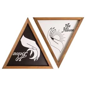 the two triangular framed boho signs are made of wood, not canvas or tin. size is 12*12*0.59 inches. the encouraging vintage wiccan wall one black and one white with a brown border, printed above the sun and moon, respectively, the inspirational phrase "As Above So Below", is a positive and inspirational indoor ornament. The back and rear hooks are easy to hang and display. chic and funny wall beautiful magic art to decorate your house, farmhouse, kitchen, bedroom, living room, bathroom, man cave, office, garage, cave, classroom, apartment, nursery, bookshelf, niche and other places. wicca motivational supplies as a creative gift for family, friends, clients, coworkers, women who love whimsical magic, horoscopes, zodiac, astrology, celestial bohemian aesthetics; bring them surprise and joy on their special day.