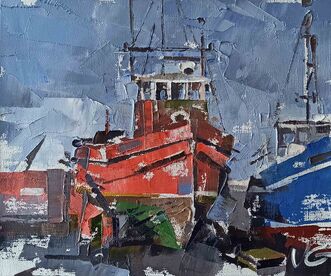 oil on canvas 25x30 cm 2021 A red boat is prominently displayed in what appears to be a marina with other vessels around it. The sky and surrounding area are rendered with rough, expressive brushstrokes.  The sea of fishing ships and boats in the docks does not leave anyone indifferent. The sophistication of their shapes and colors creates special visual plans. The white superstructures are crowned with masts, crane beams and rigging, similar to a web, they have a special technological pattern. I intended this series to be endless simply because it is impossible to stop. It is important that the paintings are small in size, 30x25 cm, and beautifully decorated in a passe-partout and frame.