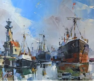 oil on canvas 60x70 cm 2023 Vivid colors and bold brush strokes create a dynamic maritime scene featuring several ships docked at a bustling harbor. Buildings with prominent towers are visible in the background, and reflections of the vessels dance on the water's surface. The painting consists of two parts and is a diptych. The plot is fictitious. The canvases depict a port city raid at the beginning of the 20th century. Accent details of the picture are the old lighthouse and cargo ships of various sizes and displacements standing in the roadstead waiting for their turn and the silhouette of the old city, buried in a lilac haze. The busy life of the port and docks, the barely audible cry of seagulls and the gradually increasing noise of the docks take us to the era of human evolution and technological development, to Europe at the beginning of the 20th century.