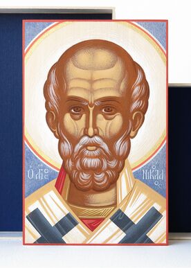 Saint Nicholas of Myra 9 x 14 x 1.4 cm Condition: New Materials: The icon is painted in egg tempera technique on a linden board. The outline around the figure is decorated with gold leaf. The front and back sides are varnished. The icon comes in a box made of hard white cardboard.
