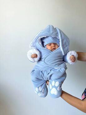 Warm set for a newborn. 0-3 months Bunny jumpsuit Outside fabric - Velour Inside fabric - fur Filler - siliconized synthetic padding 100 g / m2 Size of jumpsuit 0-3 months Blanket size 90x90 cm The set includes: jumpsuit + bow + hat + blanket + belt