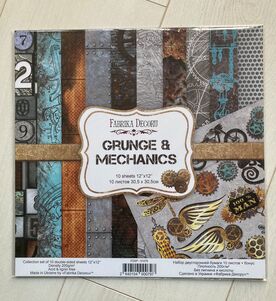 Includes: - 12x12 paper pad "Grunge and mechanics" - die cuts "Grunge and mechanics" - stickers "Grunge and mechanics"