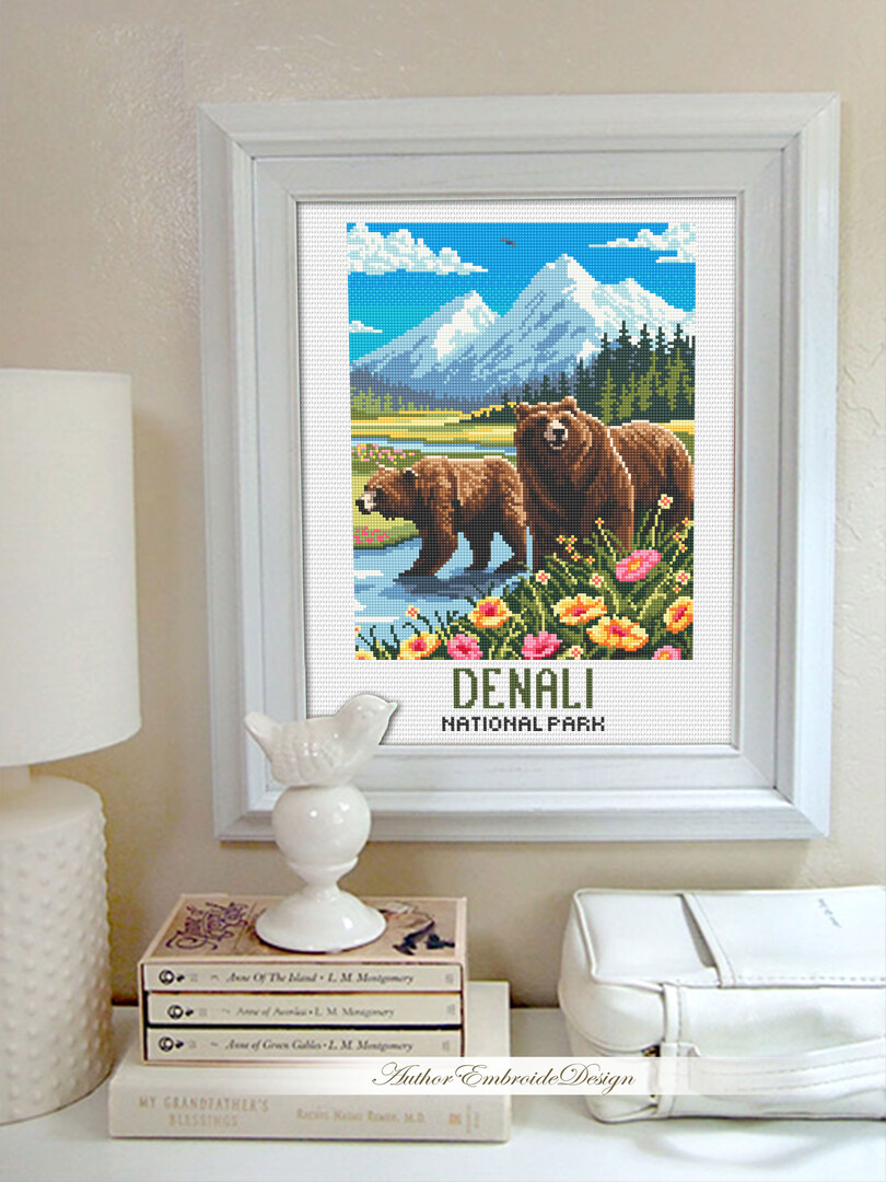 Denali national park cross stitch pattern PDF download Bear cross stitch chart, Mountain landscape pattern digital PDF, Travel poster #L99