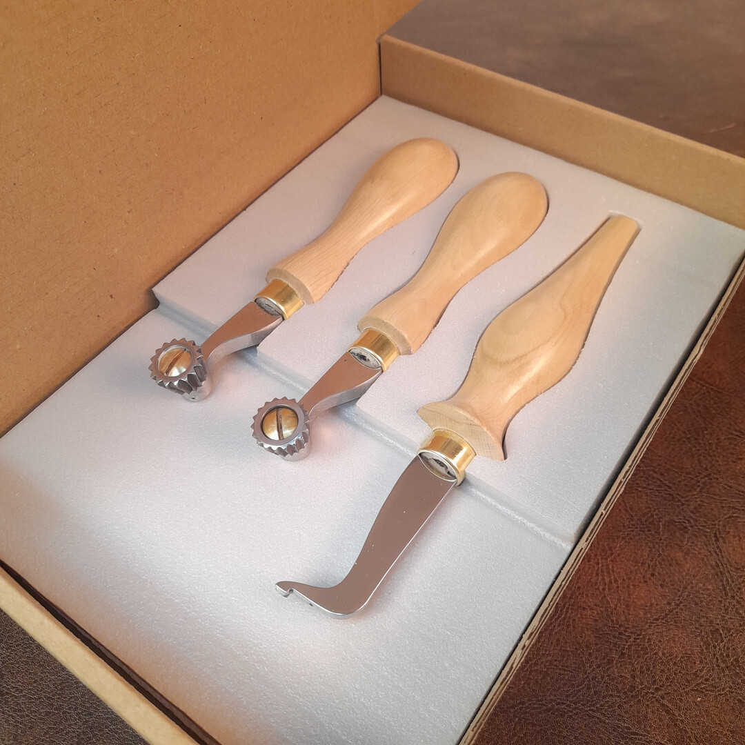 Product Quantity Edge Iron EI-C : RS-A Beech, natural 8mm Ring color: Brass 1 Waist iron WI-S : Beech, natural RS-A 8mm Ring color: Brass 1 Fudge wheel FW-S : RW-A Beech, natural 20spi Ring color: Brass 1 Round awls : 65mm noname Germany 1 Stitching awls : 60mm KING 1 Stitching awls : 65mm MAEDER 1 Stitching awls : 65mm KING 1 Welting Awls : 60mm MAEDER 2 Welting Awls : 65mm MAEDER 1