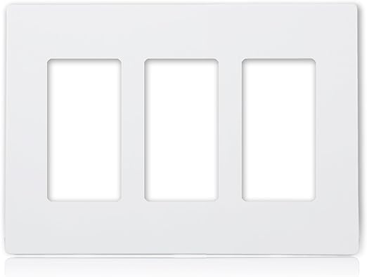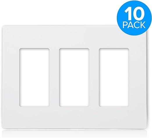 This 10-pack of 3 gang decorator wall plates features a screwless design for a clean, modern look around your switches and outlets. Also called triple decorator wall plates or light switch covers, they each encase 3 switches or outlets in one convenient place. They fit over rocker switches, outlets, dimmers, timer switches and more. These wall plates are UL listed. Sub-plate screws ensure proper alignment on your wall. Screws are included.