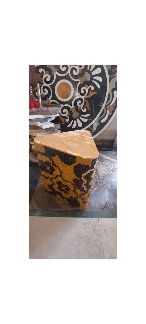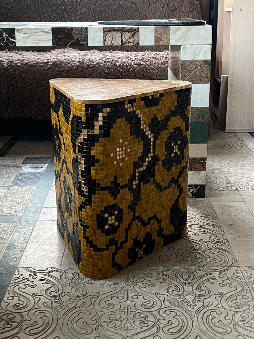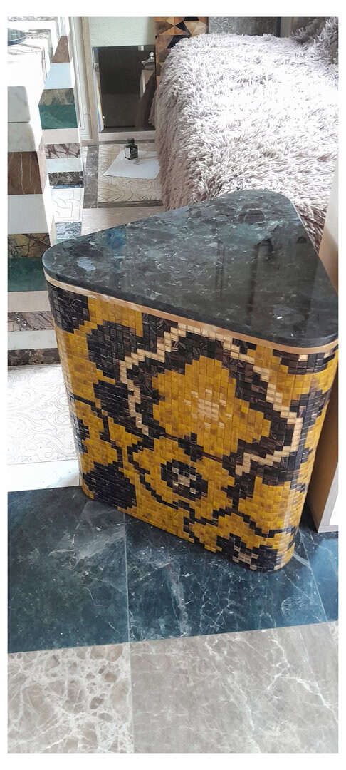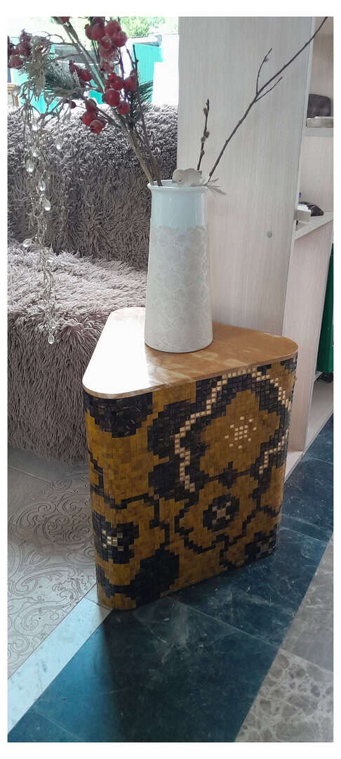 Pouf for home comfort. It is made of glass mosaic with a marble tabletop. Also used as a coffee table.Handmade mosaic table with flower pattern - triquet shape. Experience your home decor with this sleek, handcrafted accent table with a colorful floral mosaic design. This model combines artistry with functionality to make it ideal as an effective side table, display stand or decorative piece of furniture. Product characteristics: • Unique design: a table decorated with a mosaic of warm burgundy, black and gold shades, embellished with a bright checkered pattern.Premium materials: natural marble and brilliant mosaic. Shape: Rounded knitted shape with crinkled edges - ideal for casual or eclectic settings. • Functionality: pouf for a side table or a table. It can be used as a stand for coffee, a bedside table, a pedestal for roses, or as a base for an art exhibition.Height: 42 cm, width: 45 cm, depth: 45 cm. Weight: 10 kg.