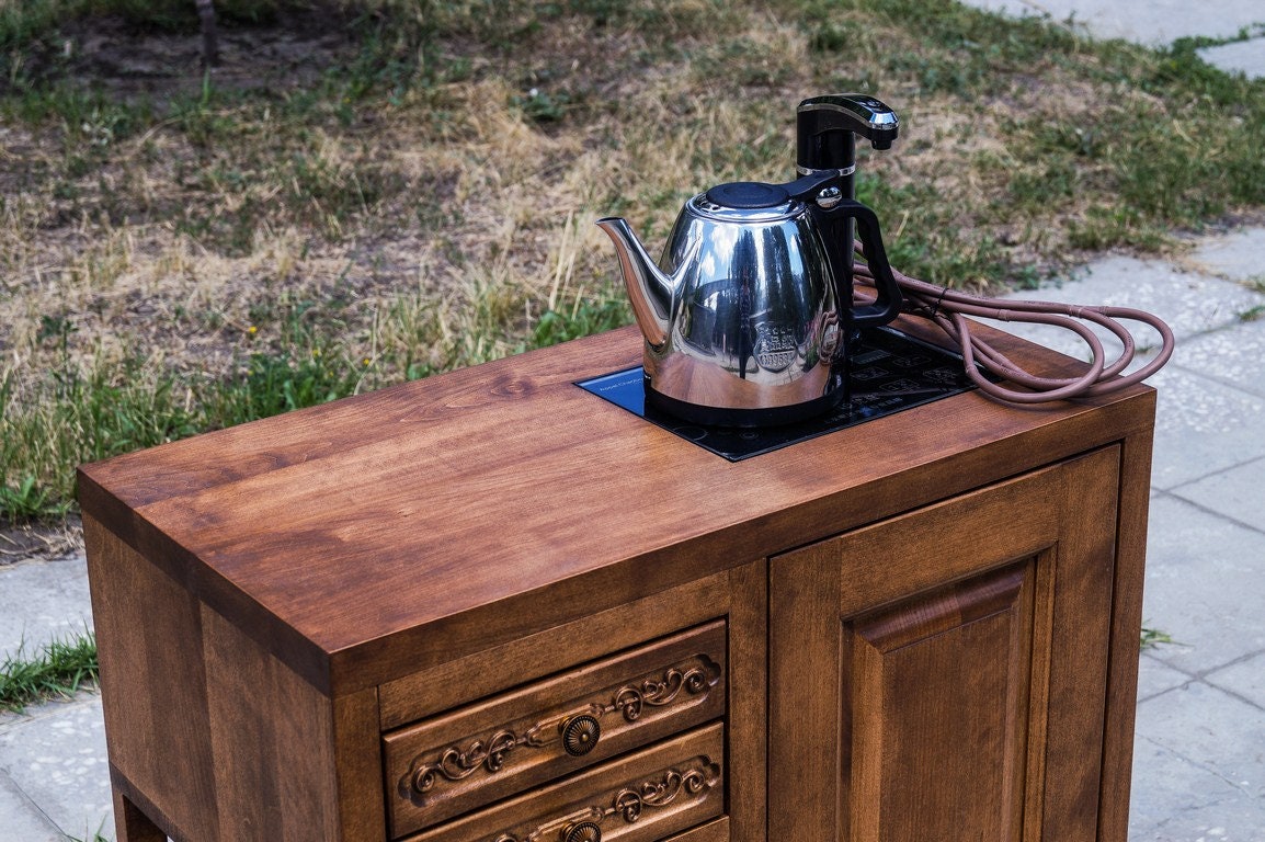 The cabinet has drawers for storing tea and dishes, an open shelf for display, a compartment for a large bottle of water and a built-in stove for heating water. The stove has the ability to set the temperature and an automatic function for filling the kettle with water.